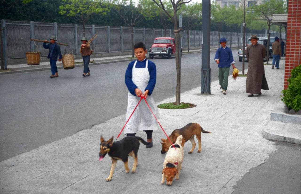 这是1931-1939年间上海街头,一个有钱人家雇佣的专业遛狗师傅,他外罩整洁的白色围裙,正牵着三只宠物狗走在人行道上,街道另一侧有挑着沉重担子的底层劳工,人行道上还有穿长衫的路人,远处更能看到轿车驶过。 当时的上海,富裕阶层(富商、租界外籍人士、洋行高管等)会专门雇佣遛狗师傅、厨子、佣人等服务人员,而同期底层民众多靠挑担、体力劳作糊口,遛狗师傅的“轻闲”服务与劳工的辛苦营生同框,恰好戳中了当时上海尖锐的贫富分化与阶层割裂。