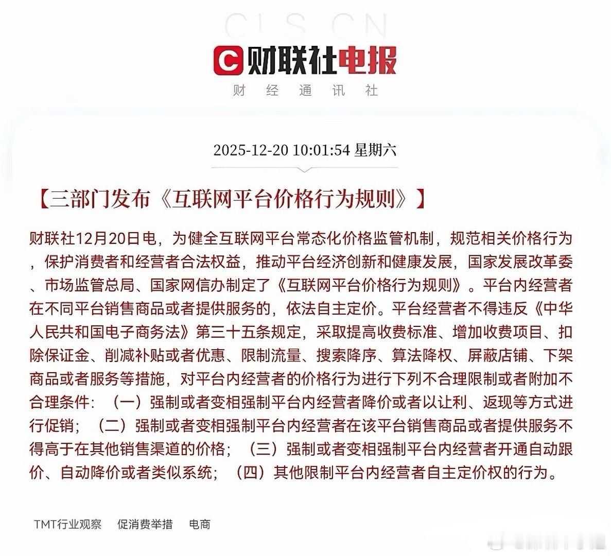 重大利好!三部门联合发布!下周平台经济概念估计要一飞冲天了!周六上午10点01分,财联社消息,为健全互联网平台常态化价格监管机制,规范相关价格行为,保护消费者和经营者合法权益,推动平台经济创新和健康发展,三部门联合发布了《互联网平台价格行为规则》,平台经济迎来重大利好政策,大消费板块迎来大利好新规的发布并非意在打压平台经济,而是通过立规矩来促发展,目的就是引导市场从无序的价格战转向有序的价值战,这将有利于互联网平台良性发展,是大利好政策,对于消费者而言,能减少甚至杜绝消费陷阱,如大数据杀熟,捆绑销售,自动续费扣款等消费困扰,让消费者买的放心,买的称心,对于平台上的商家也是大利好,这是三赢的好规则!股民们!平台经济迎来重大利好新规,坐稳扶好!预计下周平台经济,以及部分消费行业的核心公司要起飞了!
