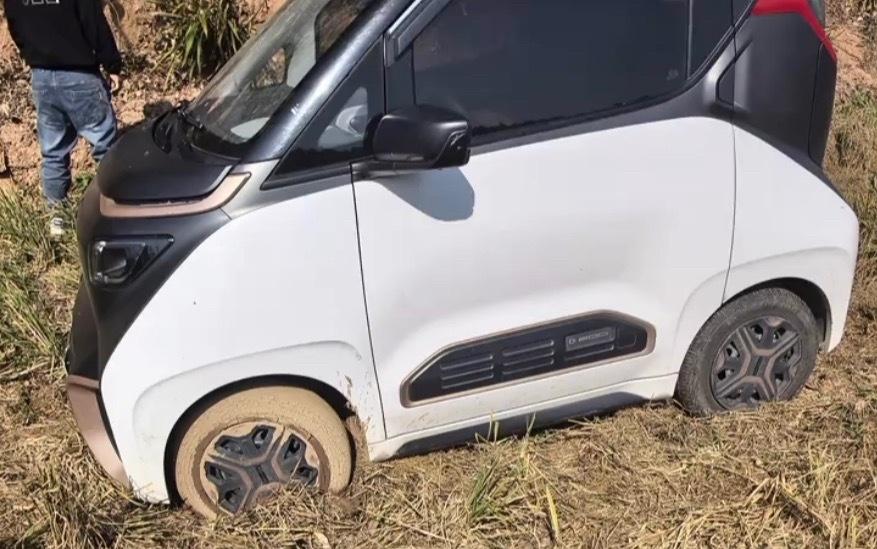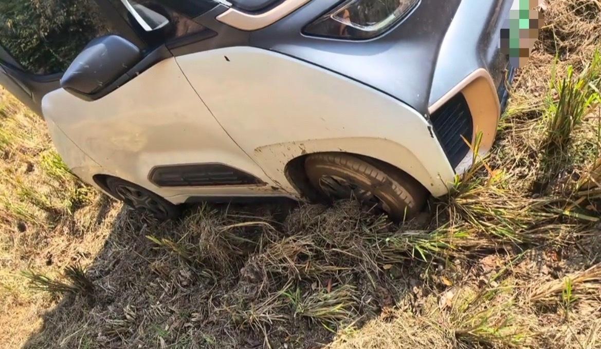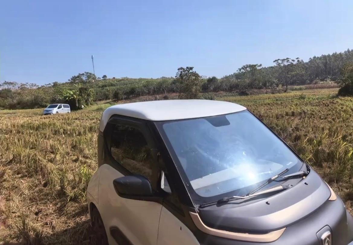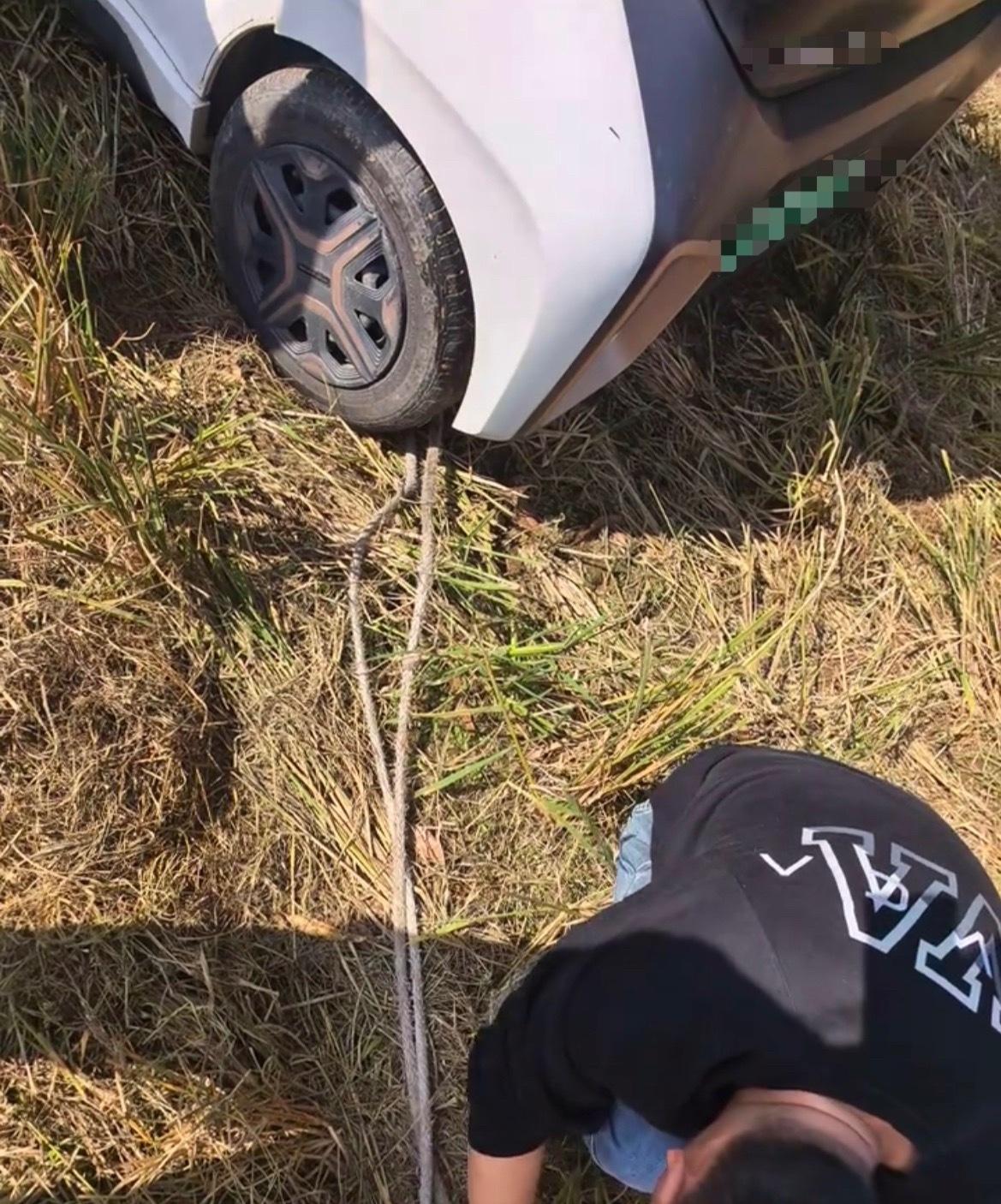 【玉林一新能源小车冲进稻田男子用绳拉】近日,玉林市博白县一辆新能源小汽车冲进了稻田里面去。现场有男子用绳子去绑拉起来。