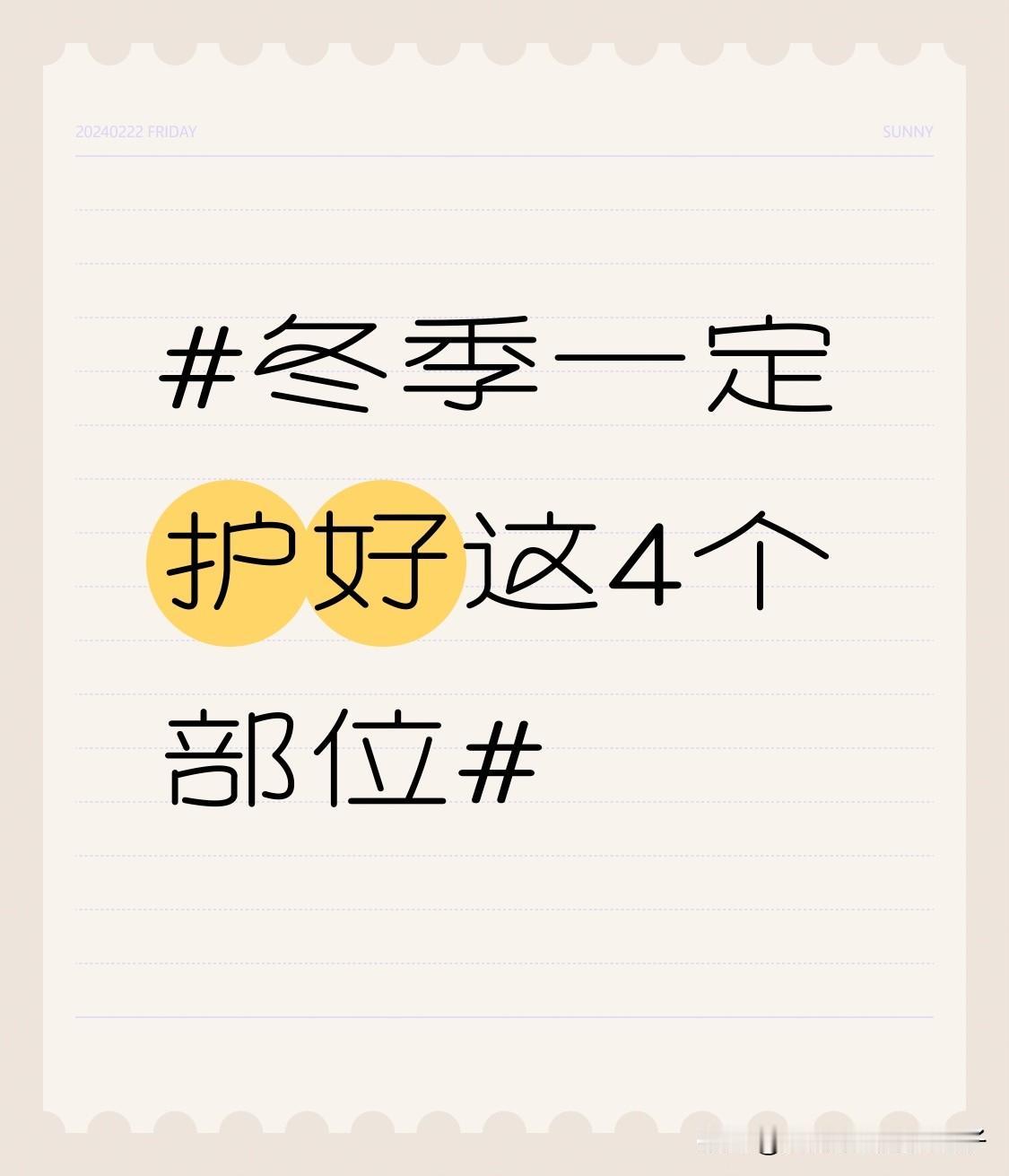 冬季一定护好这4个部位 冬季寒冷干燥,这4个部位可得好好护着。 皮肤首当其冲,干燥易干裂瘙痒。我每天都给脸和手涂保湿霜,还少洗热水澡,怕把皮肤油脂带走。多喝水,一周敷几次滋润面膜,皮肤水分就锁住啦。 关节也得保暖,寒冷会让它僵硬疼痛。我冬天常散步、拉伸,促进血液循环,还会戴上护膝。 呼吸道在冬季更要保护,病毒多易感冒。我出门戴口罩,室内用加湿器,多喝温水润喉。 最后是腰部,受凉会不适。我穿厚裤子,系上腰带,工作时注意姿势,还常做腰部拉伸。护好这4个部位,冬天才能温暖健康。
