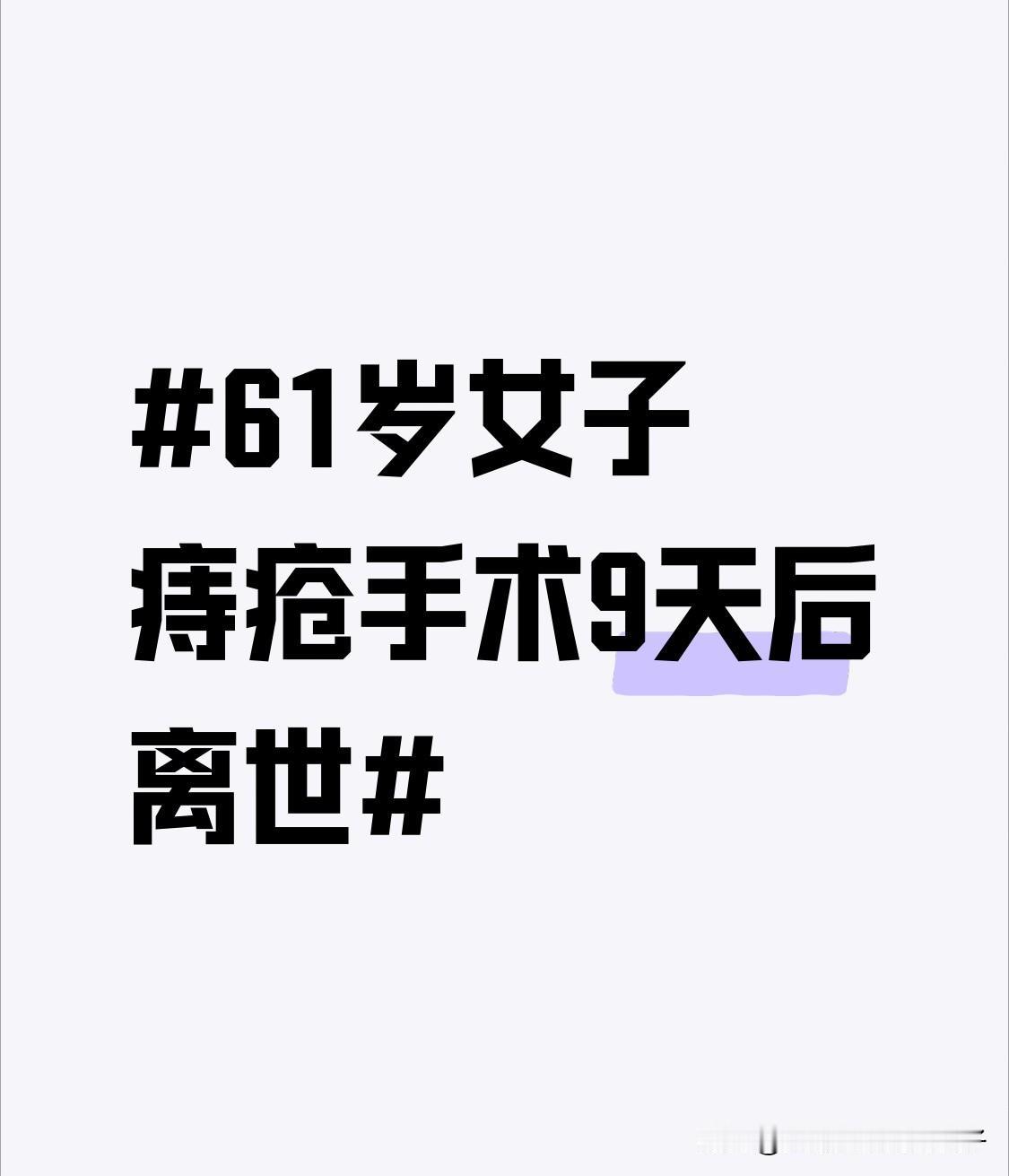 61岁女子痔疮手术9天后离世 甘肃天水61岁的王女士,本以为痔疮手术是小风险手术,12月2日在市中医医院做完手术后却在9天后不幸离世。20年前她也曾在这家医院做过同样手术,这次因离家近又选择了这里。术后第6天她高烧到39摄氏度,退烧后臀部、腿部疼痛,家属反映情况,医生称是正常术后反应。12月10日腿部疼痛加剧,家属三次求助值班大夫,大夫却没来病房查看。家属质疑术后诊疗不全面,目前已进行尸检。天水市卫健委也已介入处理。这起事件给人敲响警钟,小手术也不能掉以轻心,医院诊疗的全面性太重要了。