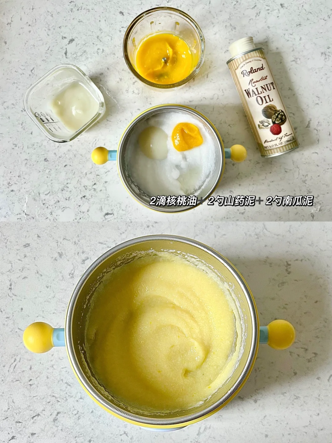 📝:7.5米粉➕70ml水,2滴核桃油➕2勺山药泥➕2勺南瓜泥