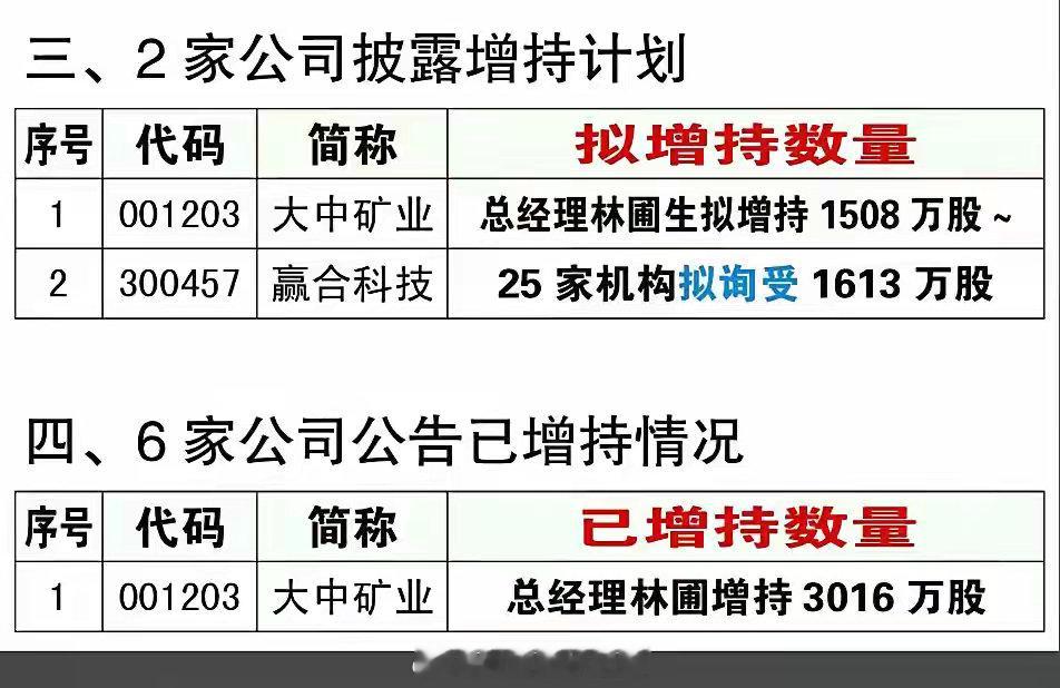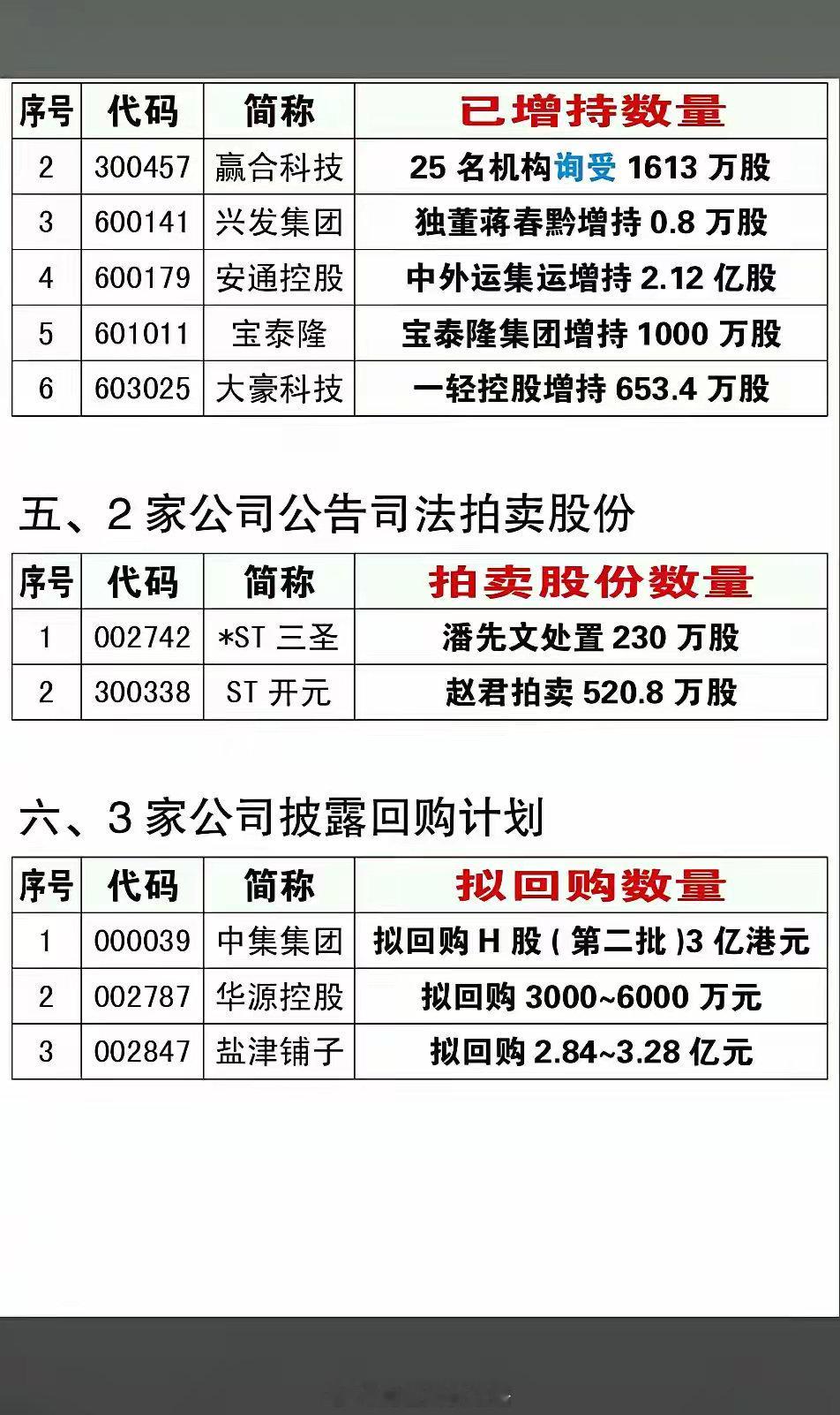 12月20日,下周A股这些股票有望大涨!!!2家公司近期披露增持计划;6家公司披露已增持情况,重点关注:大中矿业总经理增持3016万股,后市值得高看一眼;3家公司披露回购计划,重点关注:中集集团拟回购H股3亿港元,后市值得期待;4家公司公告注销回购股份,后市值得重点关注!!!