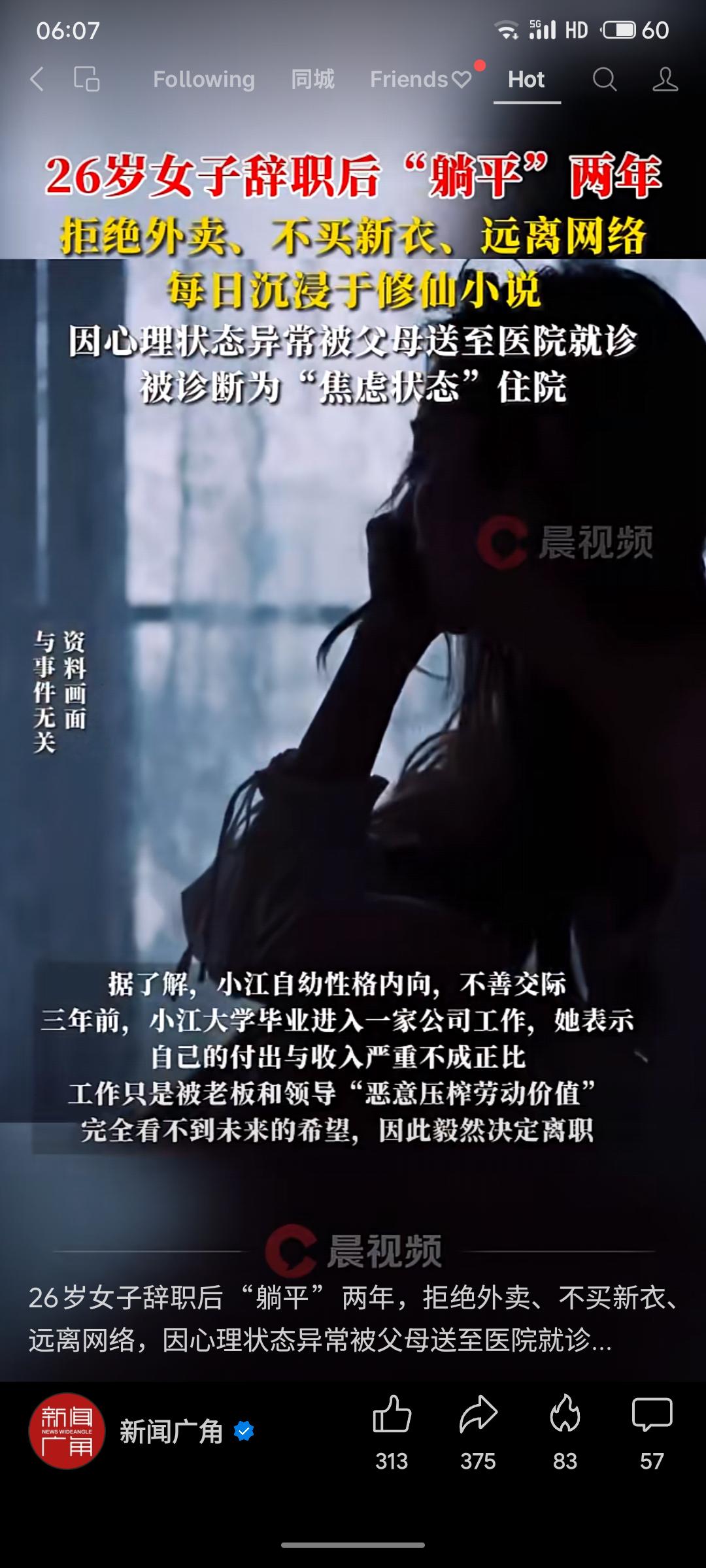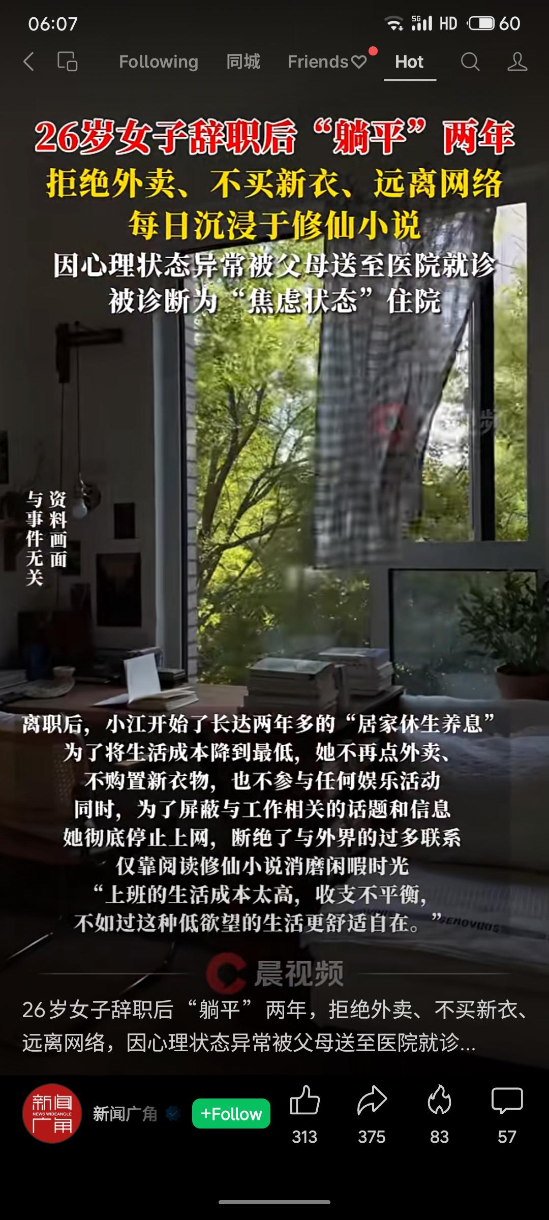26岁的江苏女子小江因对职场“付出与收入不成正比”感到绝望,选择辞职“躺平”两年,通过拒绝外卖、不买新衣、远离网络和沉浸修仙小说来降低生活成本与心理压力,最终因心理状态异常被父母送医,确诊为“焦虑状态”并住院治疗。