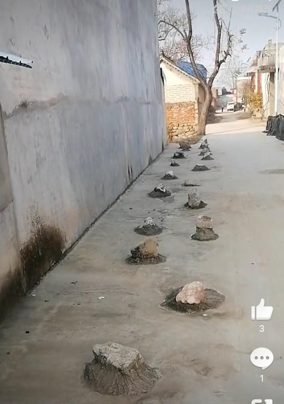 河南南阳堂河县,网友发视频吐槽:农村绝户坡会时不时的看到噶一次,但像这种的还是第一次见,这该叫什么? 我就纳闷了,他在这自家的墙边搞这种尖尖的石头桩子,到底意欲何为呢?为了防止自家房子的地基不被过往路人踏坏掉?他就不怕晚上有人骑车从这里过摔跤吗? 这种损人不利己的行为做出来,是不是脑子被门缝夹了啊!!!
