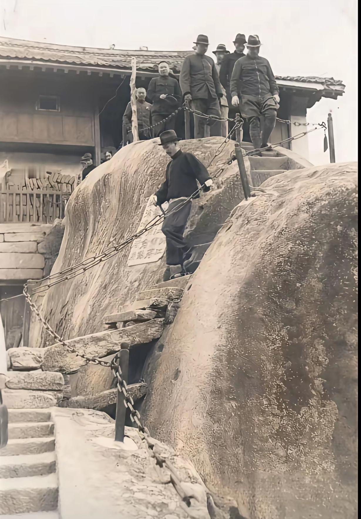 1936年10月26,张学良陪同蒋介石游览华山时留下的珍贵照片。此次华山之行是蒋介石为试探、敲打张学良而发起的政治互动,蒋以“剿共为先”施压,张则坚持“停止内战、联共抗日”,两人在登山时已貌合神离。 此次登山后仅47天,1936年12月12日西安事变爆发,张学良与杨虎城发动兵谏,逼迫蒋介石放弃“攘外必先安内”政策。