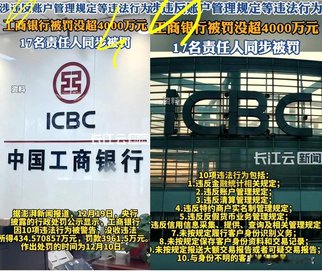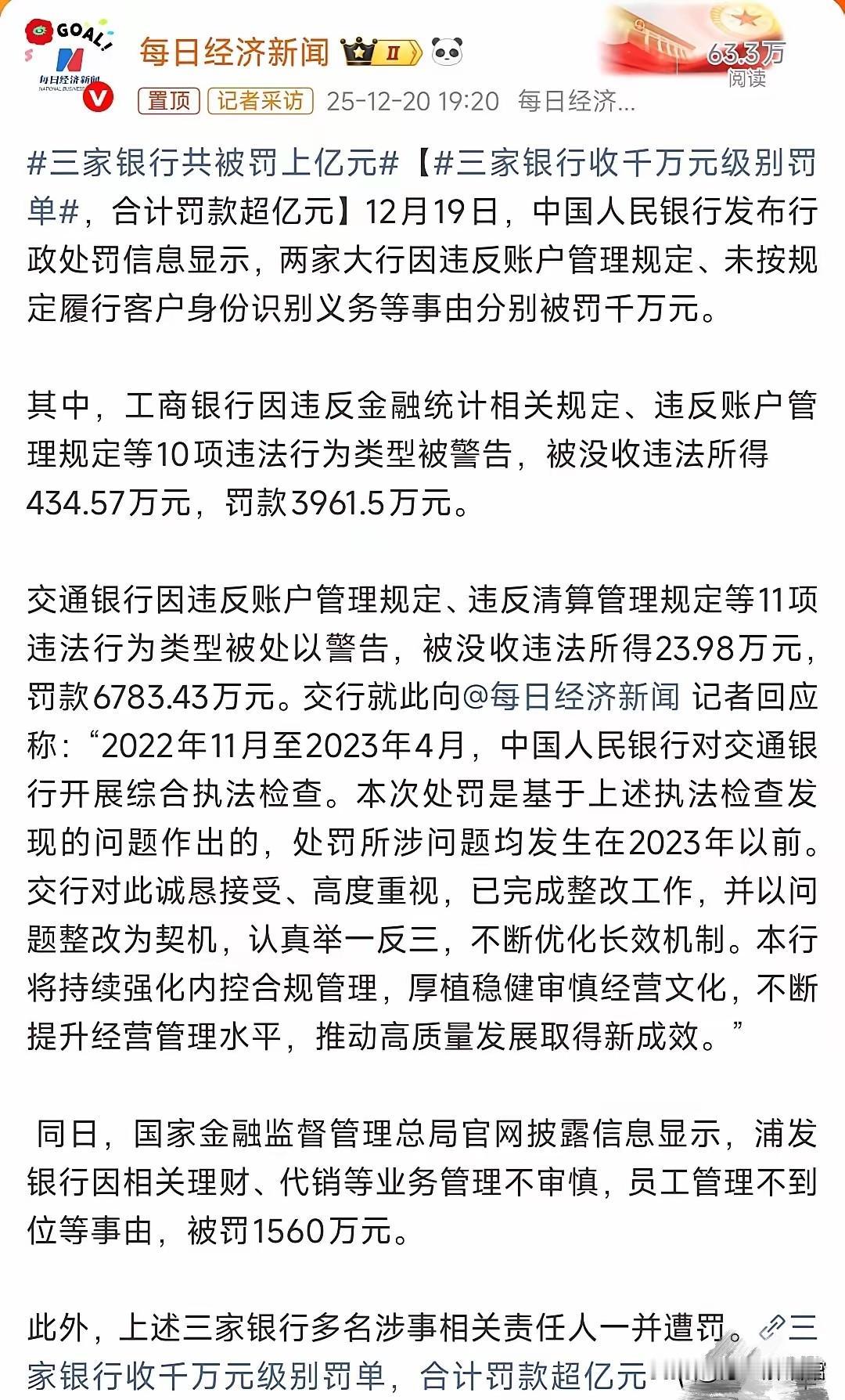 三家银行共被罚上亿元 12月19日这一天,银行圈可“炸锅”了,三家银行共被罚上亿元。工商银行因10项违法行为,像违反金融统计、账户管理规定等,被警告,没收违法所得434.57万元,罚款3961.5万元。交通银行更严重,11项违法行为,包括账户、清算管理违规等,被警告,没收违法所得23.98万元,罚款6783.43万元。浦发银行也因理财、代销业务管理不审慎,员工管理不到位等,被罚1560万元。而且,这些银行的多名责任人也一并受罚,还有人被禁业。银行作为金融体系的重要部分,合规经营太重要了,希望它们能吸取教训,好好整改。
