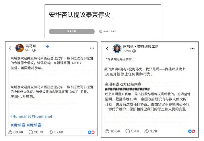 柬埔寨首相洪马奈遭遇“停火说国际性社死”。马来西亚总理安华-易卜拉欣亲自给泰国总理阿努廷写的打假信件说辞,被阿努廷放到网上了。造谣细节被当场拆穿,洪马奈扭曲安华原意的闹剧,使洪马奈失去话语信任权。 安华:尊敬的阿努廷总理,我的声明没有提到停火,我只是说——我建议从晚上10点开始停止任何挑衅行为。我没有说双方已经同意。 洪马奈将私人建议、未被对方承认的建议包装成了东盟和美国的国际倡议,扯大旗拉虎皮的操作,看之令人发笑。 人品有问题,洪家不值得信让。
