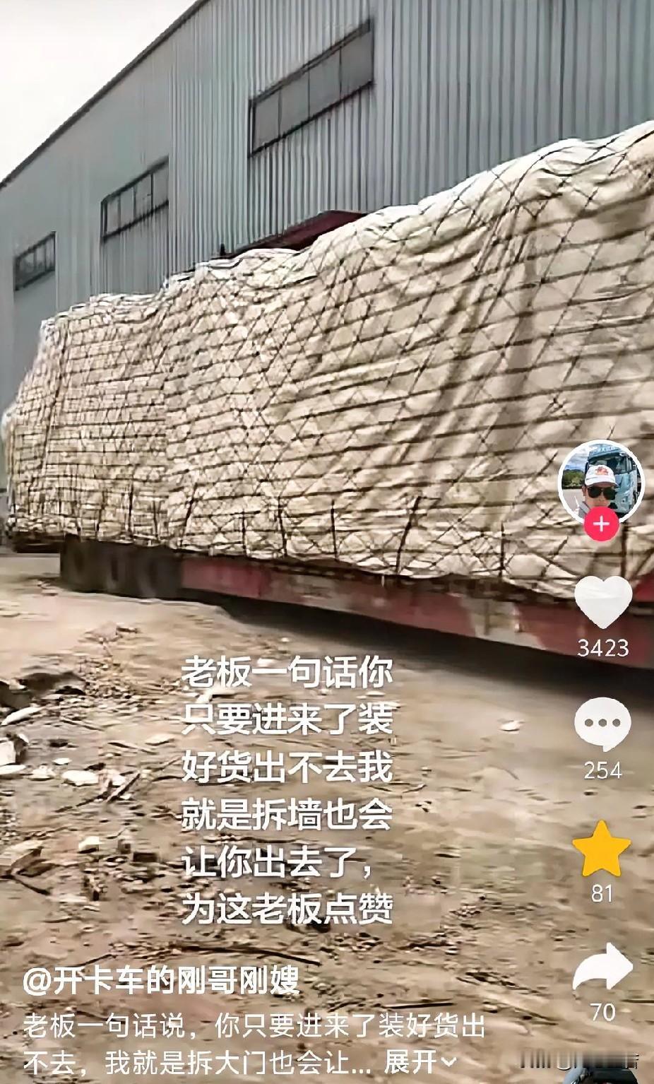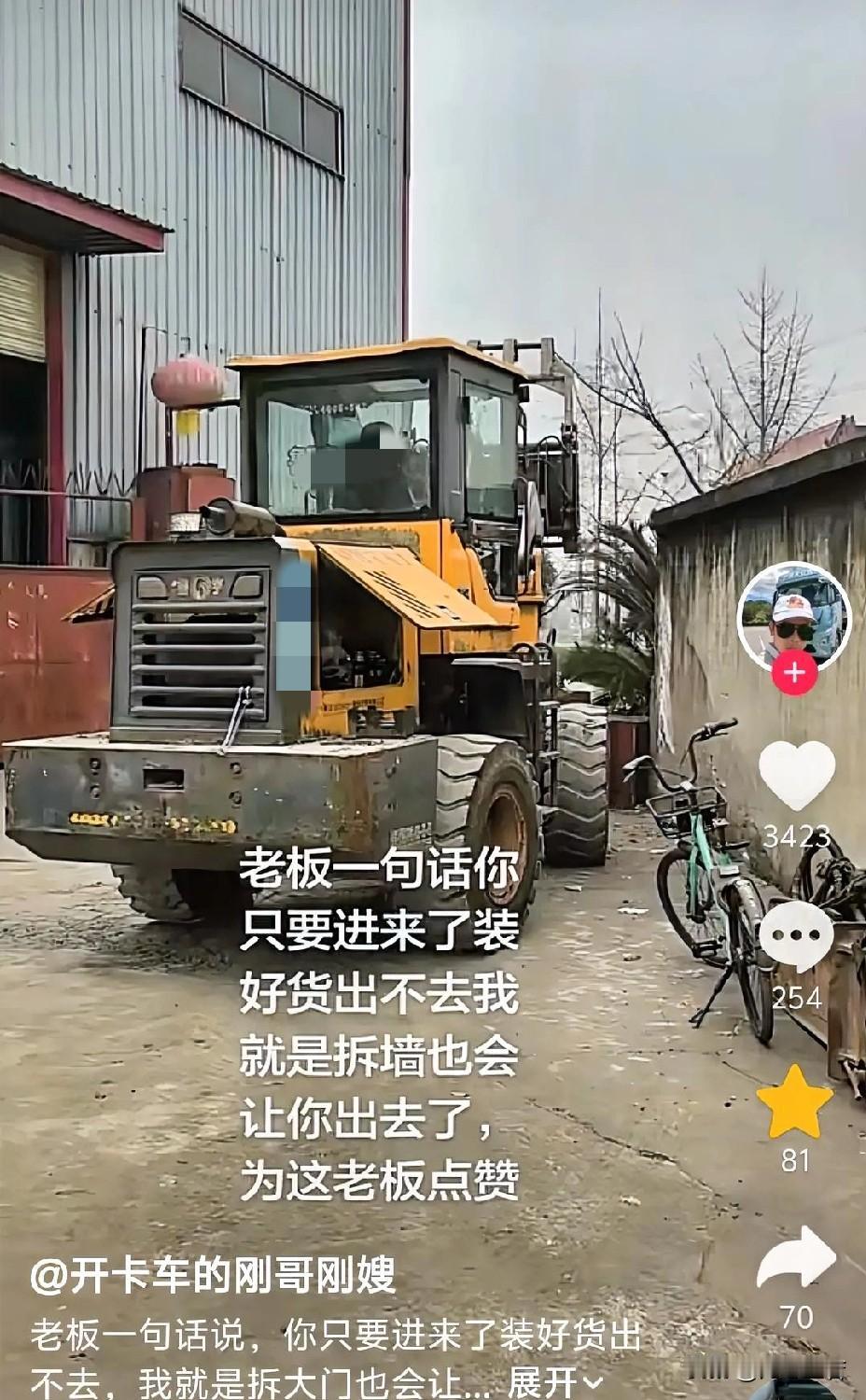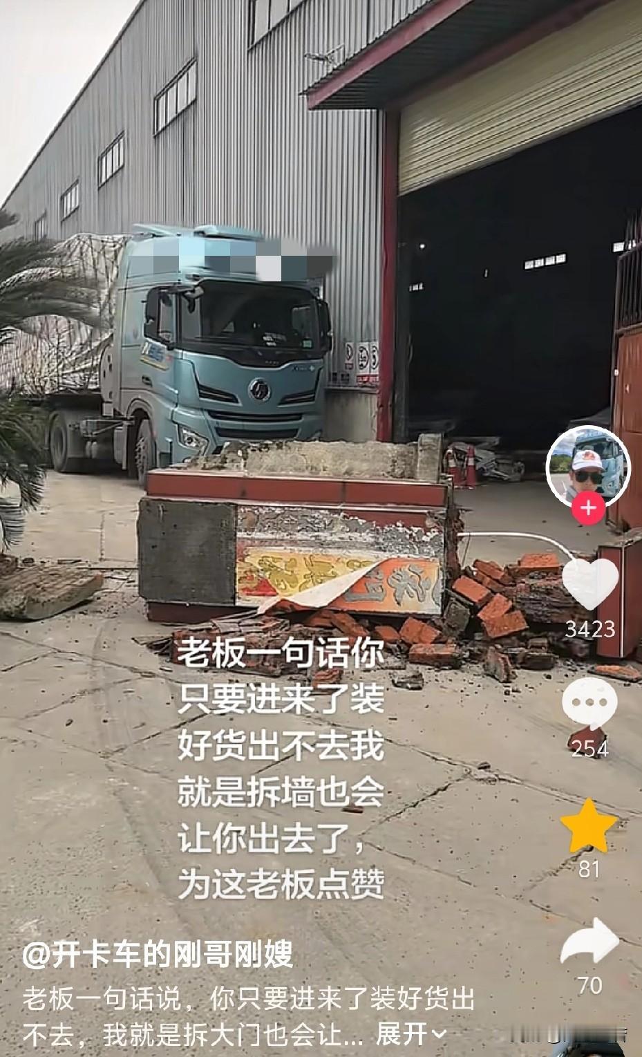 近日,四川成都,一名卡车司机去村里装货,他查看了一下地形,给老板说,这位置空车可以进去,重车调头就难了,根本出不来。 没想到,老板听了司机的话,拍着胸膛信誓旦旦地说,你只要进来了装好货,如果出不去,我就是把墙拆了也得让你出去。 司机师傅有点将信将疑,还是照着老板的话去做了。果然,装完货之后出不来了,他正打算去找老板商量一下,老板摆了摆手,掏出手机。 不一会儿,外面就来了一辆装载机,在老板的指挥下,三加五除二就把大门和院墙推倒了。司机师傅终于放了心,表示必须给信守承诺的老板点赞。 看了视频,确实应该为老板的担当点赞,不仅能让司机师傅瞬间安下心来,更能看出他是个把“解决问题”放在第一位的管理者。 对于司机来说,装货后出不去是很棘手的困境,老板一句“拆墙也让你出去”,相当于直接替他扛下了所有压力,这种不推诿、不找借口的态度,值得点赞。 从生意角度看,这也是很聪明的做法。物流环节卡壳,影响的不只是这一单的交付,更是客户对公司的信任,老板的决定,实则是守住企业的信誉底线。哪怕是付出拆墙的成本,也不能让客户等、让司机慌,这种“结果导向+人文关怀”的结合,远比很多空泛的管理口号更能凝聚团队、赢得口碑。 说到底,大家愿意为这样的老板点赞,本质上是认可他身上的责任感和魄力,不把压力转嫁给一线员工,而是主动成为团队的后盾。这样的管理者,不管是带团队还是做事业,都很难不成功。(来源:开卡车的刚哥刚嫂)