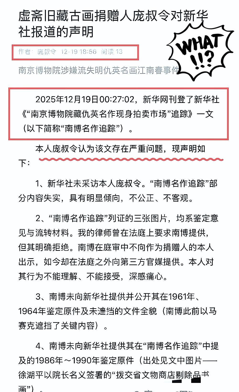 庞家,硬刚新华社,点名查办前院长, ​明牌打了,丝毫面子不给, 让吃瓜群众看了个目瞪口呆。 南博把捐赠真迹标“赝品”贱卖,关键鉴定材料打码藏猫腻,藏品去向说不清楚,庞家从起诉要知情权到申请强制执行,一步步被敷衍到撕破脸。 手里没实锤证据,谁敢这么明牌硬刚? 徐前院长签字铁证摆在那,却甩锅“没经手”,还拿“老弱病残”卖惨,1997年签字时年富力强,现在倒忘了自己的职责? 庞家选在香港发声太明智,开放的舆论环境能让更多人看清南博的偏颇操作。 这事儿早已不是单纯的文物纠纷,是公众对文博系统公信力的拷问。 你觉得庞家手里的实锤,能把多年的猫腻彻底锤死吗?