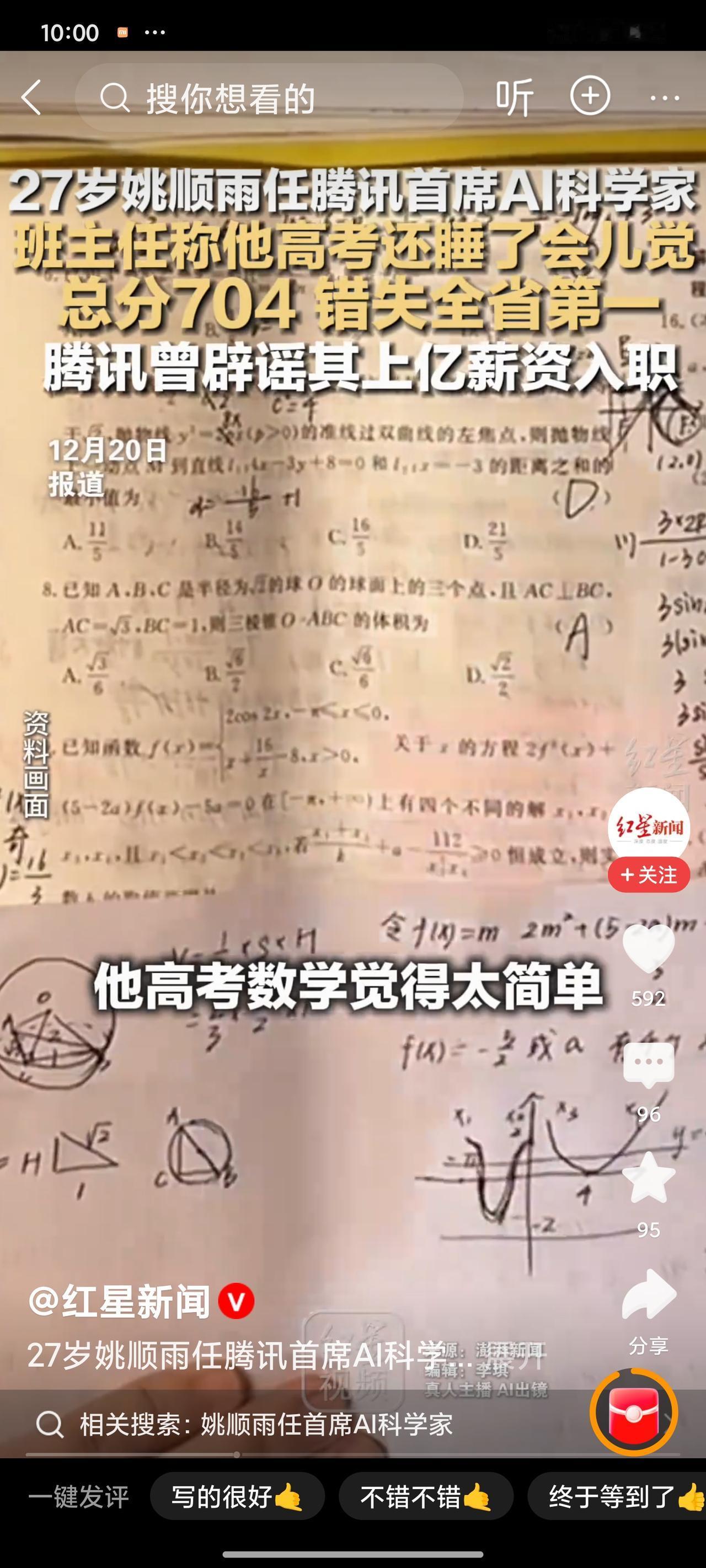 高考睡一觉,错失省状元;27岁时,执掌腾讯AI!网友热议沸腾 安徽学霸姚顺雨,高考时数学答完便睡,丢了十几分,与省第一失之交臂。 有人骂他“轻狂之举,毁了前程”,也有人赞其“实力傍身,自有任性资本”。 他早在之前就凭借奥赛银牌进入清华姚班,如今年仅27岁,就成为腾讯最年轻的首席科学家,在AI领域取得世界级成果。 💡我的看法:高考绝非人生的终点,真正的实力才是通行的硬通货。 你认为这“遗憾”是否值得? 高考时,你会反复检查,还是自信交卷呢? 如何看待姚顺雨加入腾讯