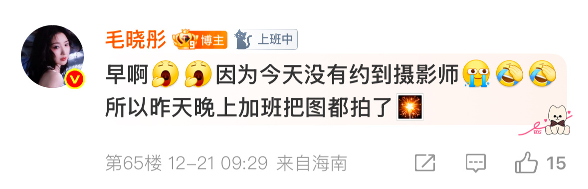 毛晓彤星光大赏没约到摄影师毛晓彤好有活人感啊哈哈哈哈哈哈昨晚深夜打卡海边撒欢+下班,原来是因为今天星光大赏没约到摄影师,所以只能提前突击拍完出发图。看毛晓彤发的海边照片不知道妆造是不是和海有关,真的好期待她今天星光大赏造型,等姐投喂细糠~2025娱乐年终盘点非正式跨年派对