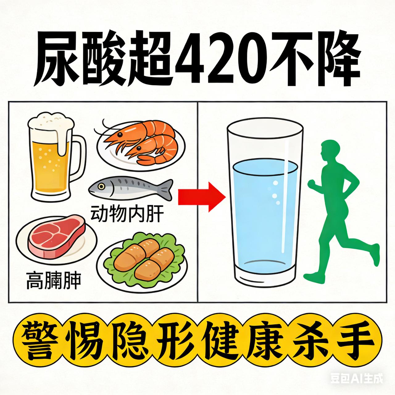 尿酸超 420 不降?警惕这些隐形健康杀手 尿酸超420μmol/L,身体亮起“红灯”,降不下来这些疾病或将来袭 当体检报告上那刺眼的尿酸值突破420μmol/L时,可千万别不当回事。尿酸,作为人体嘌呤代谢的最终产物,本应在体内维持着微妙的平衡。然而,一旦它的水平升高,就像一颗悄然埋下的“定时炸弹”,不仅可能引发令人痛苦不堪的痛风,还会对肾脏、心血管等重要系统发起悄无声息却又极具破坏力的攻击。 痛风:关节的“酷刑”之痛 痛风,堪称尿酸升高后最直接且令人闻之色变的后果。当血液中的尿酸浓度如同脱缰的野马般飙升,超出其溶解度时,尿酸盐结晶便如同锋利的冰晶,在关节及其周围组织肆意沉积。这些结晶宛如无数根细小的钢针,无情地刺向关节,瞬间引发一场激烈的“炎症风暴”。患者往往会毫无征兆地在夜间被一阵剧痛惊醒,只见关节处红肿得如同熟透的番茄,皮肤滚烫,仿佛被烈火灼烧,关节活动更是变得异常艰难,每动一下都像是被千万根针同时扎刺。第一跖趾关节、踝关节、膝关节等部位,成为了痛风发作的“重灾区”。 倘若尿酸长期得不到有效控制,痛风便会像幽灵般反复纠缠。关节内的尿酸盐结晶会如同滚雪球一般,不断增多、增大,逐渐形成坚硬的痛风石。这些痛风石就像一颗颗“定时炸弹”,不仅会让关节变得畸形,失去原本的形态和功能,严重时还会导致关节功能障碍,使患者连最基本的行走、抓握等动作都变得困难重重,生活质量一落千丈。 肾脏:沉默的“牺牲品” 肾脏,作为人体重要的排泄器官,默默承担着排出尿酸的重任。然而,当尿酸升高时,肾脏却成了首当其冲的“牺牲品”。尿酸盐结晶如同不速之客,在肾脏内悄然沉积,引发尿酸性肾病。在疾病的初期,患者可能仅仅表现为轻微的蛋白尿、血尿,这些细微的症状很容易被忽视,就像暴风雨来临前的平静。 但随着病情的逐渐恶化,结晶体积不断增大,如同堵塞管道的杂物,逐渐阻塞肾小管,导致肾积水。肾积水就像一个无形的枷锁,紧紧束缚着肾脏,使肾脏受到持续的压迫,肾功能也随之逐渐受损。患者开始出现水肿、乏力、恶心、呕吐等症状,生活质量大打折扣。如果病情进一步发展,最终可能引发肾衰竭,患者不得不依靠透析或肾移植来维持生命,这不仅给患者带来巨大的身体痛苦,也让家庭承受着沉重的经济负担。 心血管系统:隐匿的“杀手” 尿酸高对心血管系统的危害,就像隐藏在暗处的杀手,悄无声息却又致命。尿酸盐结晶会像一把把锋利的刀刃,损害血管内皮细胞,使血管壁变得粗糙不堪,为动脉粥样硬化的形成创造了“温床”。动脉粥样硬化就像血管里长了一层厚厚的“斑块”,导致血管狭窄、血流不畅,如同一条原本宽阔的河流被泥沙淤积,水流变得缓慢而艰难。这使得高血压、冠心病等心血管疾病的发生风险大幅增加。 此外,尿酸还如同一个“促凝剂”,促进血栓形成,使血液黏稠度如同浓稠的粥一般增加,容易在血管内形成血栓。一旦血栓堵塞了重要的血管,如冠状动脉、脑动脉等,就会引发心绞痛、心肌梗死、脑卒中等严重的心脑血管意外,如同平静的湖面突然掀起惊涛骇浪,瞬间将患者推向生命的悬崖边缘。 应对之策:多管齐下,守护健康 面对尿酸升高带来的种种威胁,我们绝不能坐以待毙。在饮食方面,要像严格的守卫一样,严格限制高嘌呤食物的摄入,动物内脏、海鲜、肉汤等高嘌呤“雷区”要坚决避开。同时,要像拥抱健康使者一样,增加新鲜蔬果、全谷物和低脂乳制品的摄入,这些食物富含维生素、矿物质和膳食纤维,如同天然的“清道夫”,有助于促进尿酸排泄。 保持充足的水分摄入也至关重要,每天饮水量建议达到2000毫升以上。多喝水就像给身体来一场“大冲洗”,可以稀释尿液,减少尿酸盐结晶的形成,促进尿酸排出。适量运动、控制体重、戒烟限酒也是必不可少的措施,它们就像健康的“守护神”,为我们的身体保驾护航。 若生活方式调整后尿酸仍居高不下,或已出现关节疼痛等症状,一定要及时就医,在专业医生的指导下接受规范的治疗,如使用降尿酸药物等。只有积极应对,才能将尿酸控制在合理范围内,守护好我们的身体健康,让生活重新焕发出光彩。
