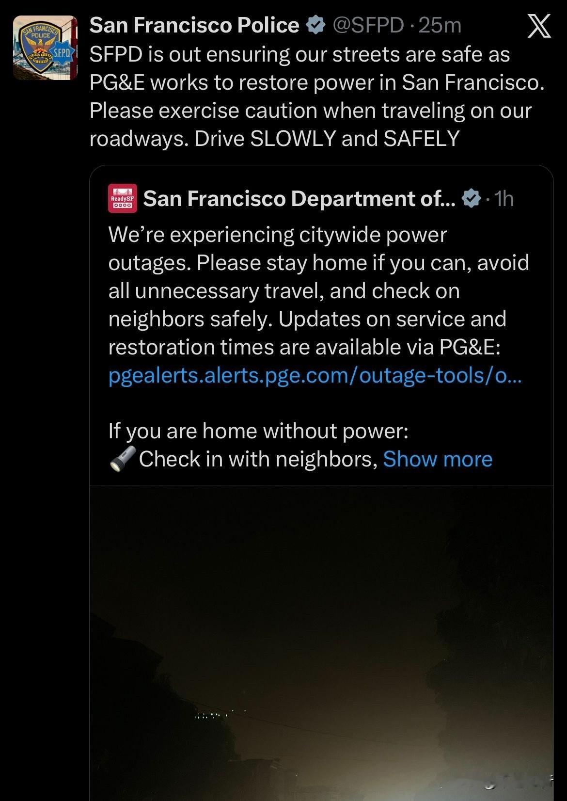 【旧金山大停电:高科技之都秒变贫民窟,Waymo像没头苍蝇】 昨天旧金山下着大雨,整座城市瞬间黑了个透。最荒谬的场面不是停电本身,而是那些平时满大街乱跑、号称代表人类未来的Waymo无人驾驶车,信号灯一灭,这帮身价几十万美金的铁疙瘩全成了路障,像一堆坏掉的扫地机器人一样死死卡在十字路口,动弹不得。13万人就在雨里摸黑,警察也没招,只能对着路人喊“要是能看清路你就开慢点”,这种废话听着简直让人发笑。其实看穿了你就明白,这哪是意外,这叫必然。PG&E这家公司在加州就是个怪胎,一个拿着政府垄断牌照、收着全美最贵电费的巨头,宁可把钱拿去给股东分红、搞政治捐款,也舍不得给那些锈迹斑斑的变电站换个零件,非得等到起火了、瘫痪了才出来发个语焉不详的通报。这就是典型的体制性腐败,上面的代码写得再智能,底层的电线还是几十年前的破烂,这种基建水平连发展中国家都不如。这帮硅谷精英每天在云端谈论AI改变世界,结果一场小火灾就让这座城市退化到了石器时代,现实就是这么冷酷,不管外壳包装得再怎么赛博朋克,只要里子是这套得过且过的官僚逻辑,停电就是这个城市的宿命。
