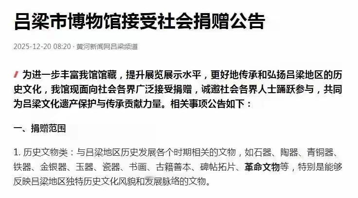 吕梁博物馆这个操作,这是给人递刀片吗?还是疑似阴阳南博? 全国博物馆都在减少发声,吕梁博物馆突然就发了一则接受社会捐赠的公告,成功吸引了大家的注意力。 我估计原因有三:一吕梁博物馆的网络不好,或者工作人员没上网。 二蹭热度,扩大接受社会捐赠的意思。 三做救火英雄。 不管怎么说,吕梁博物馆的知名度是打响了。 也侧面证明一点,博物馆的建设确实离不开社会参与,民族文化瑰宝来自民间创造。 吕梁博物馆的公告,可能只是在“错误”的时间干了一件对的事,多数博物馆从前、现在、将来也不排除会这么做,但凿壁借的光,要实实在在用在读书的正事上,才不辜负人家的信任。 希望吕梁博物馆经得住考验。