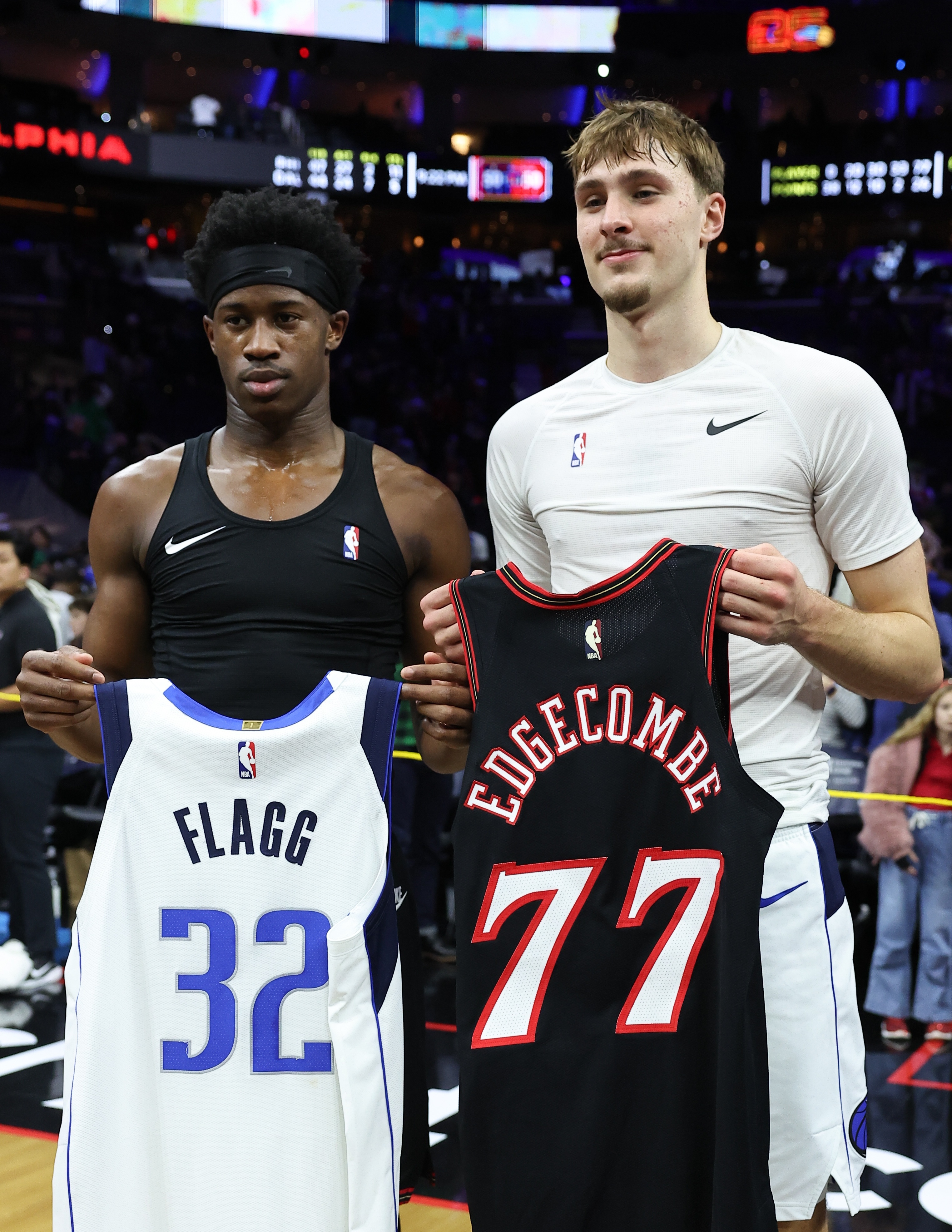 2025届状元秀✖探花秀!弗拉格和VJ·埃奇库姆赛后交换了球衣。独行侠vs76人