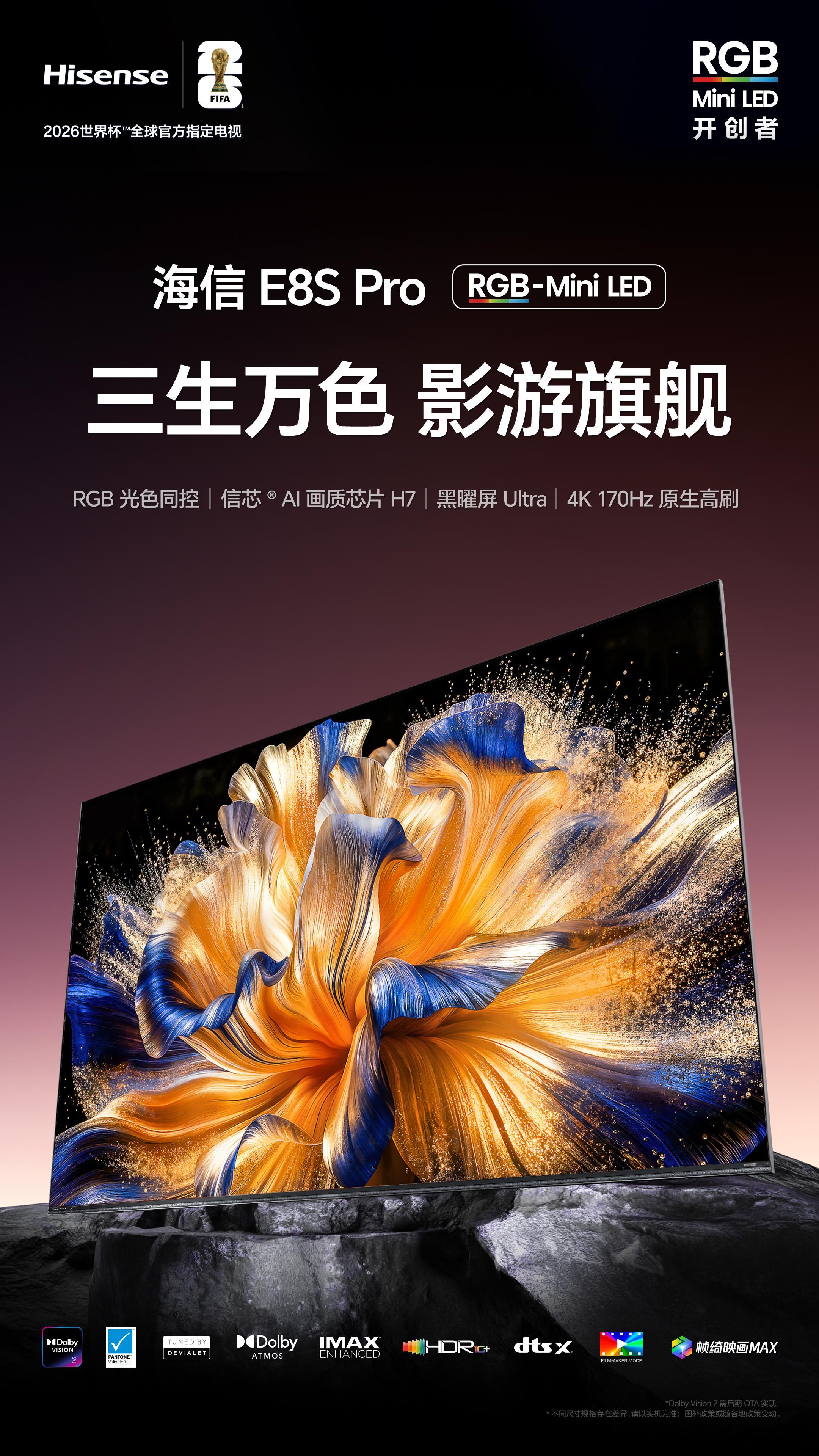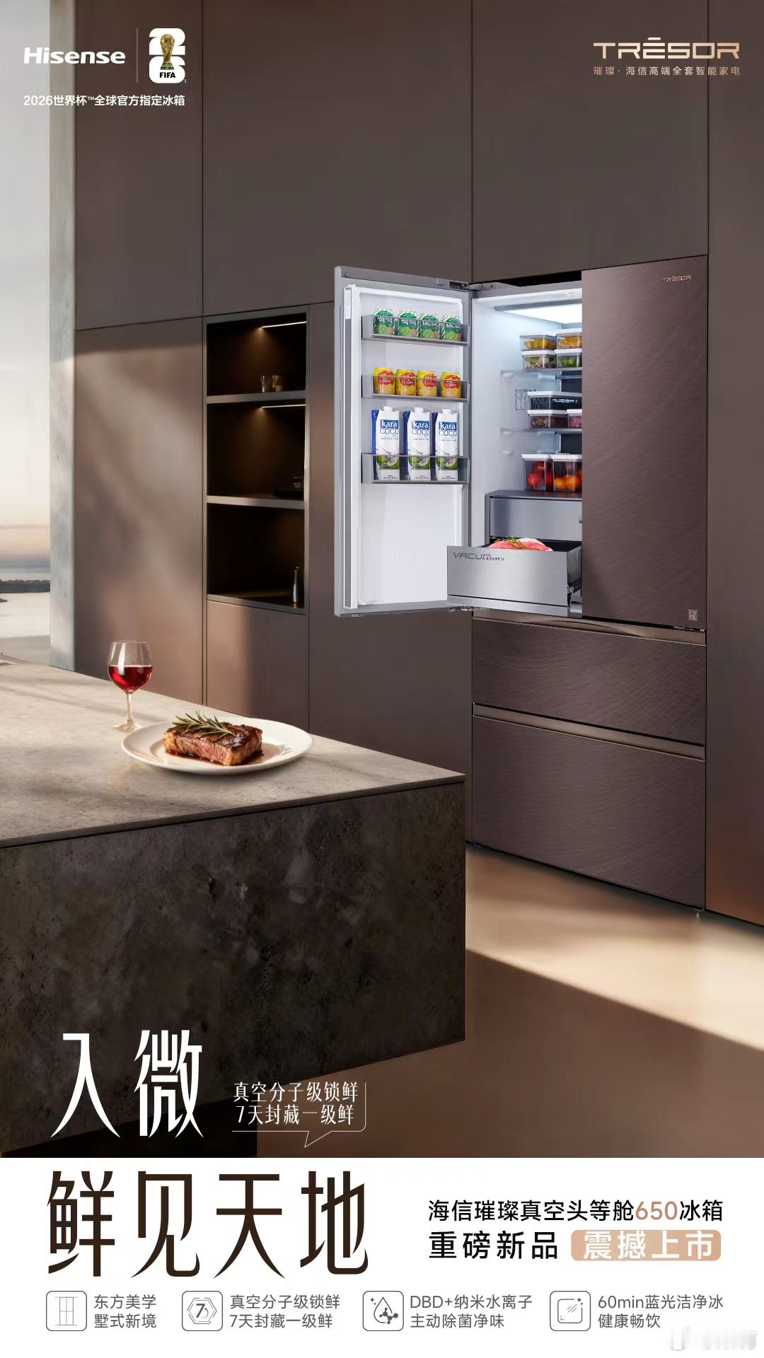 海信世界杯定制产品亮相四年一次的世界杯对于球迷而言就是一次盛大的节日,如果不能亲临现场,那就在家里复刻赛场氛围,打造富有仪式感、氛围感和沉浸感的视听盛宴,主打一个尽情尽兴看世界杯。本月上旬,国际足联公布2026世界杯赛程后,海信适时推出世界杯定制产品:电视巨幕高刷还原赛场,空调智能控风给你舒适体验,超大容量冰箱锁鲜看球美食。。可以说,海信精准拿捏球迷观赛的核心需求!海信116吋RGB-Mini LED电视可以清晰呈现赛场氛围和细节,包括球员的精准传球、门将的极限扑救、看台上的欢呼人浪、球衣的纹路、草坪的鲜活翠绿、足球的质感。。。零拖影,超高清,恰好满足球迷观赛的所有期待。作为2026美加墨世界杯官方指定电视,海信116吋RGB-Mini LED电视搭载全球领先的RGB-Mini LED背光芯片,带来三倍清晰、三倍酣畅的观赛体验,让每一个精彩瞬间都尽显现场感。值得一提的是, 海信电视曾在伦敦创下“最大规模不眨眼比赛”吉尼斯纪录,以此凸显其产品护眼优势;旗下电视U8E是刷新吉尼斯纪录的全球首款全视野电视。2026世界杯于6月11日开始,7月19日闭幕,这一个多月正好是盛夏季节,天热看球,一部给力的空调必不可少。海信大力神空调作为2026年美加墨世界杯官方指定空调,不止是制冷工具,更是懂场景的智慧空气伙伴。它搭载星闪人感智慧风技术,实现精准“风随人动”;从赛前准备到赛中高潮,再到赛后回味,它主动适配观赛状态,让你专注于热血赛事,呼吸清新空气,高科技感拉满!对于球迷们而言,足球和美食都不可辜负,窝在沙发上沉浸式观看世界杯时,茶几上的美食饮品是必不可少的看球搭子,唯有吃好喝好,才能津津有味地畅享赛事。海信真空冰箱,堪称观赛美食的最佳搭档。它拥有60分钟智能制冰功能,能快速为饮品降温,和朋友们举杯庆祝胜利时刻更畅快。650L超大容量更是惊喜,无论是零食、水果还是酒水,都能轻松收纳。有了它,无需频繁补货,只管和亲友沉浸看球,囤满所爱更尽兴。
