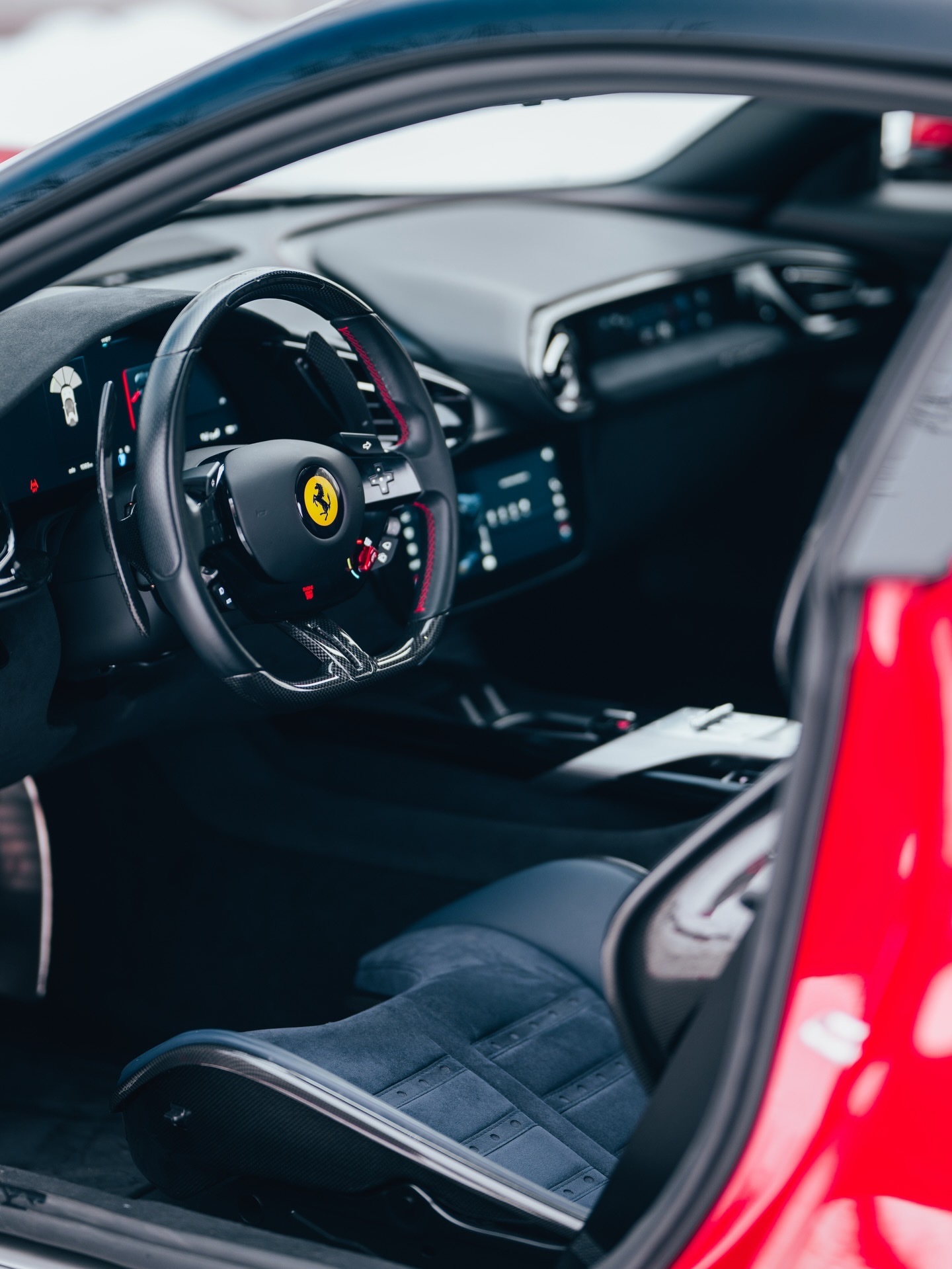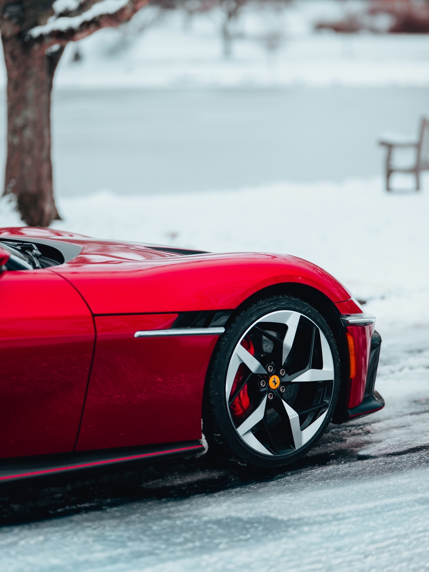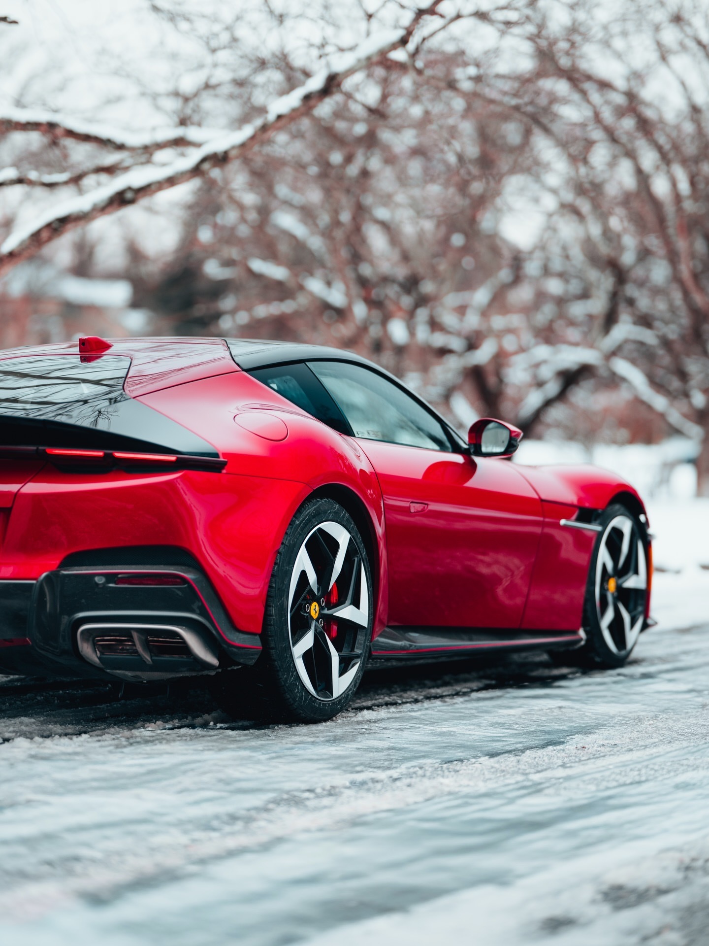 给法拉利12Cilindri装上了雪地轮胎,带它出去舒展一下筋骨!将Manettino切换到「湿滑」模式后,我们完全没有牵引力问题,即便是拥有819匹自然吸气马力的它。有人可能会拿红色的油漆和某只驯鹿开个玩笑,但那将是鲁道夫。法拉利12Cilindri豪车超跑老纪侃车