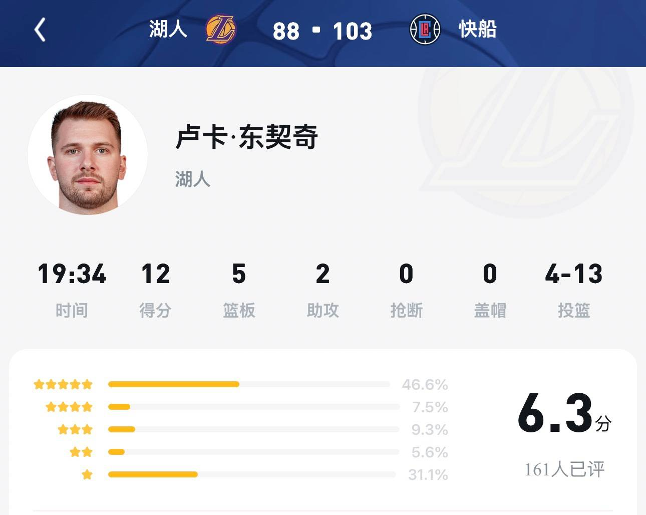 湖人对阵快船三分投篮:1、詹姆斯:7投3中2、东契奇:6投1中3、范德彪: