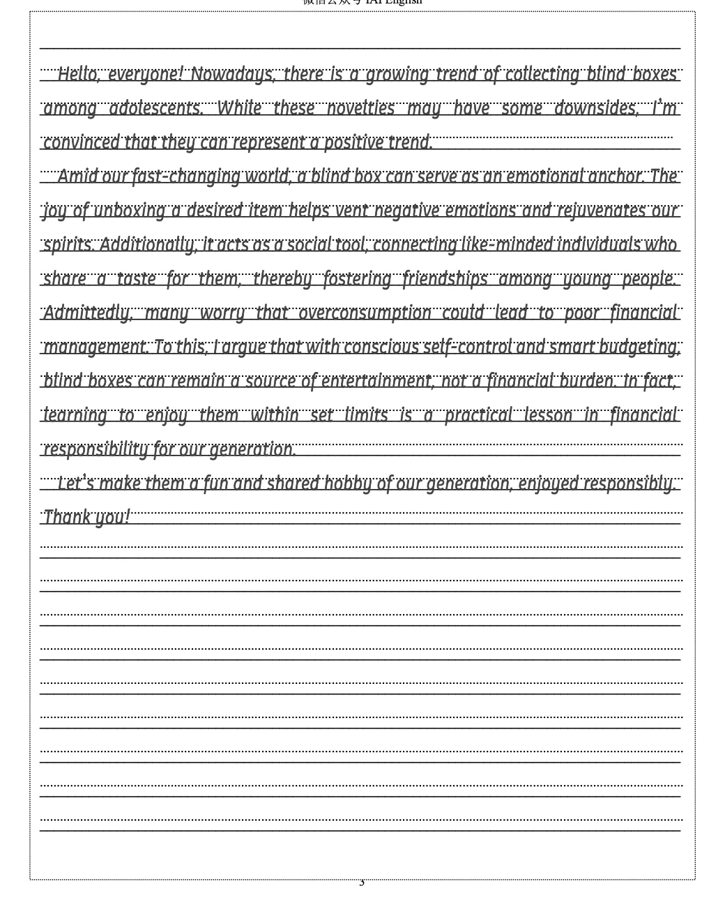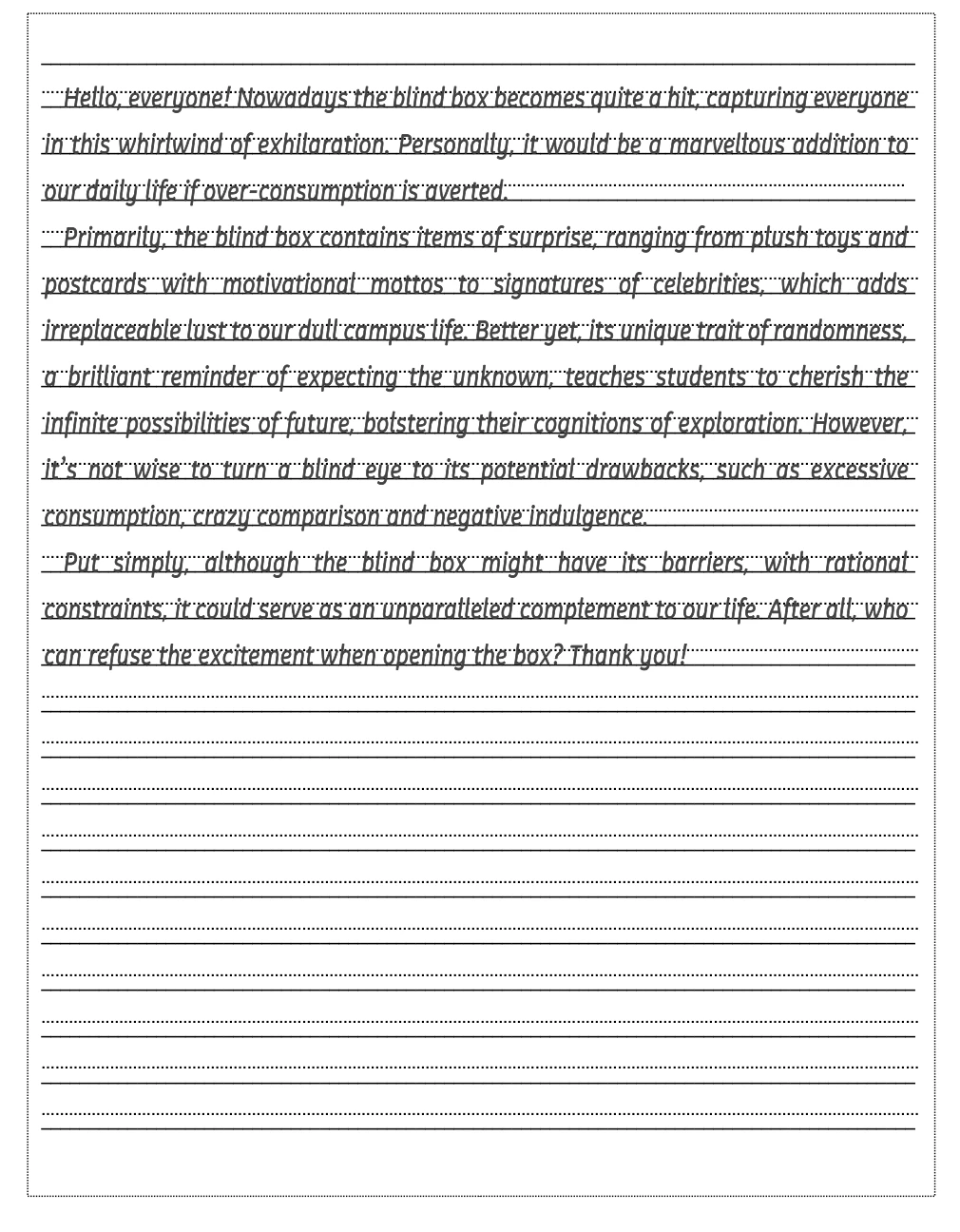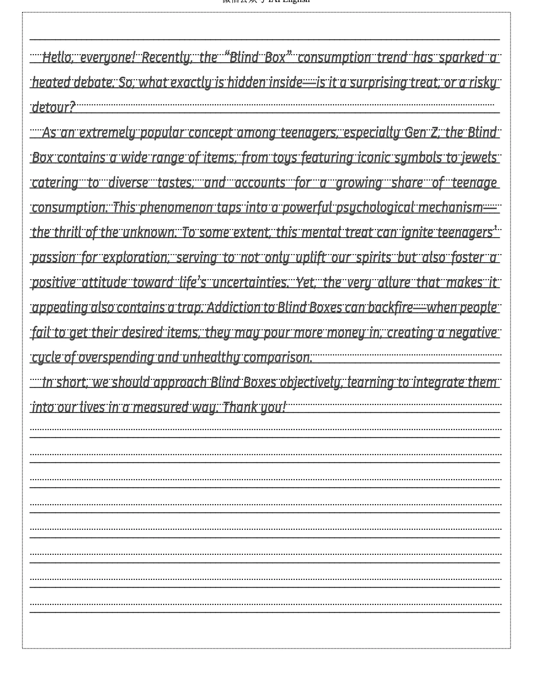 但这个题目也存在一些问题的:(1)高中应用文的篇幅有限,讨论的话题不能过于“大”。盲盒背后的盲盒经济,是甚至可以出语文大作文的程度,实在是很难在100多个单词的应用文中完整表达清楚对于这个事件的观点。所以这个话题的选取,有些“小题大做”了。(2)文章话题给的是“What’s hidden inside(深层次的‘原因’)”,但是要点的“观点”设置的相对过宽。