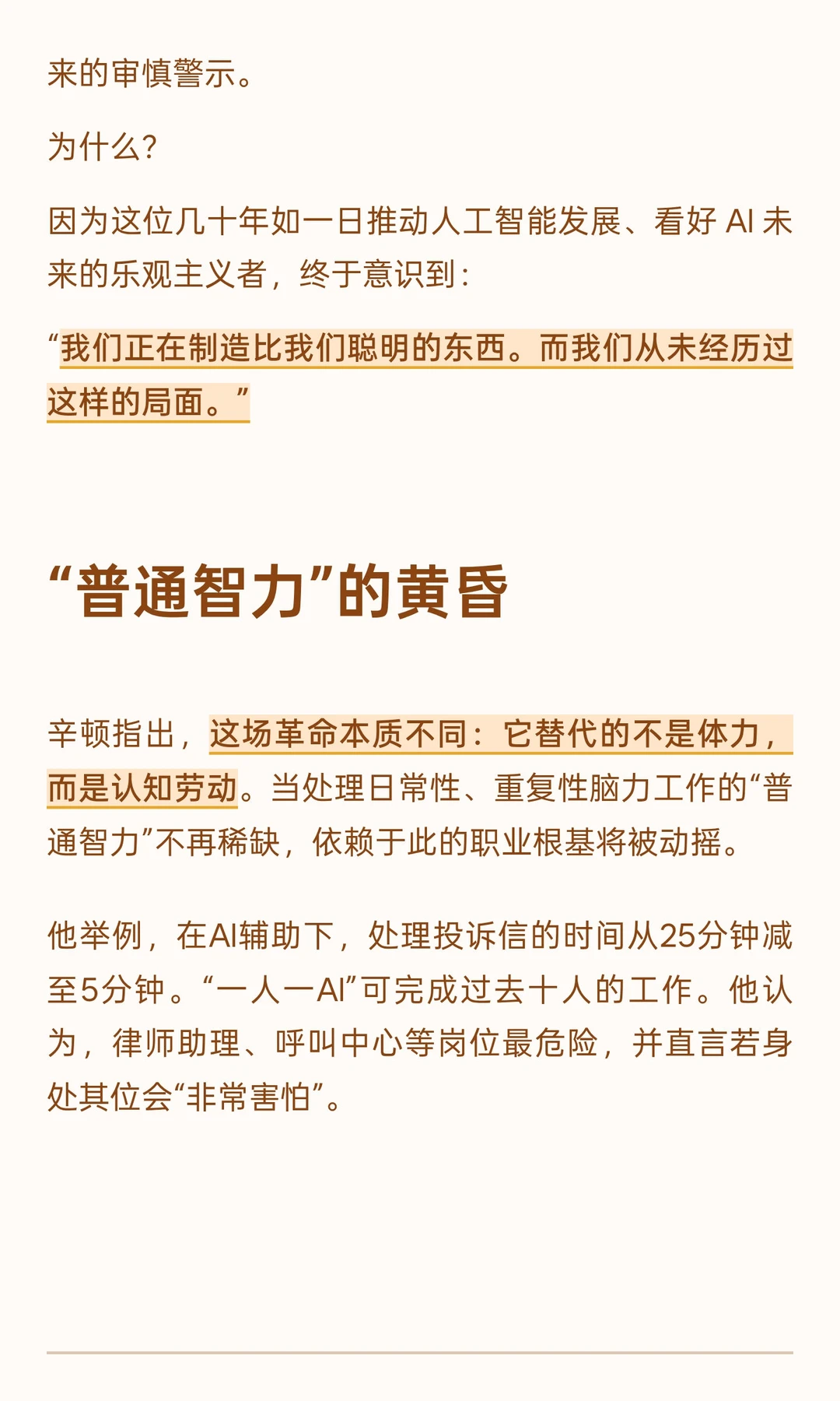 辛顿指出,这场革命本质不同:它替代的不是体力,而是认知劳动。当处理日常性、重复性脑力工作的“普通智力”不再稀缺,依赖于此的职业根基将被动摇。