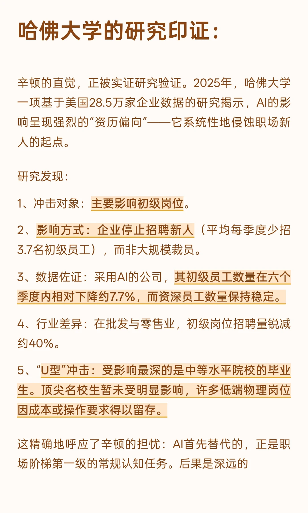 辛顿的直觉,正被实证研究验证。2025年,哈佛大学一项基于美国28.5万家企业数据的研究揭示,AI的影响呈现强烈的“资历偏向”——它系统性地侵蚀职场新人的起点。