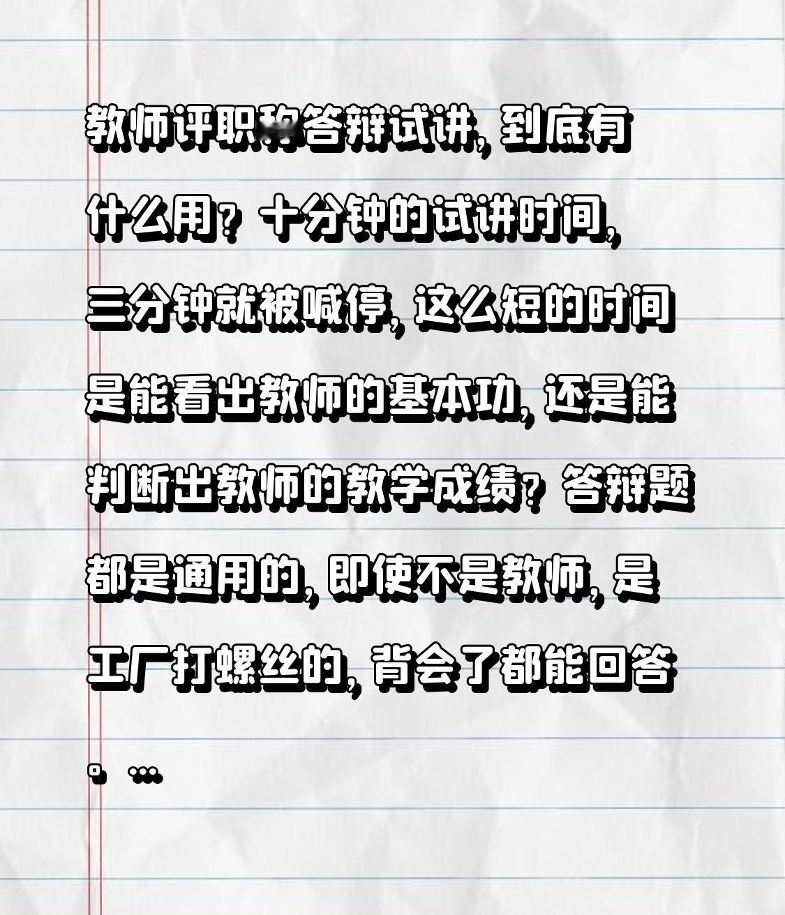 教师评职称答辩试讲,到底有什么用?十分钟的试讲时间,三分钟就被喊停,这么短的时间是能看出教师的基本功,还是能判断出教师的教学成绩? 答辩题都是通用的,即使不是教师,是工厂打螺丝的,背会了都能回答。 所以,这个环节是在考验教师的心理承受能力? 有2个教师在副高答辩现场被120拉走了。 还有很多教师身体极度不适,勉强挨过答辩。 最可笑的是,我校一名一线教师试讲答辩没过,而一个从没有上过课的中心校领导,却顺利通过了。 谁还会相信所谓的“答辩试讲”是为了甄别出一线教师? 别再折腾一线教师了! 只要教龄超过25年,就直接通过吧!
