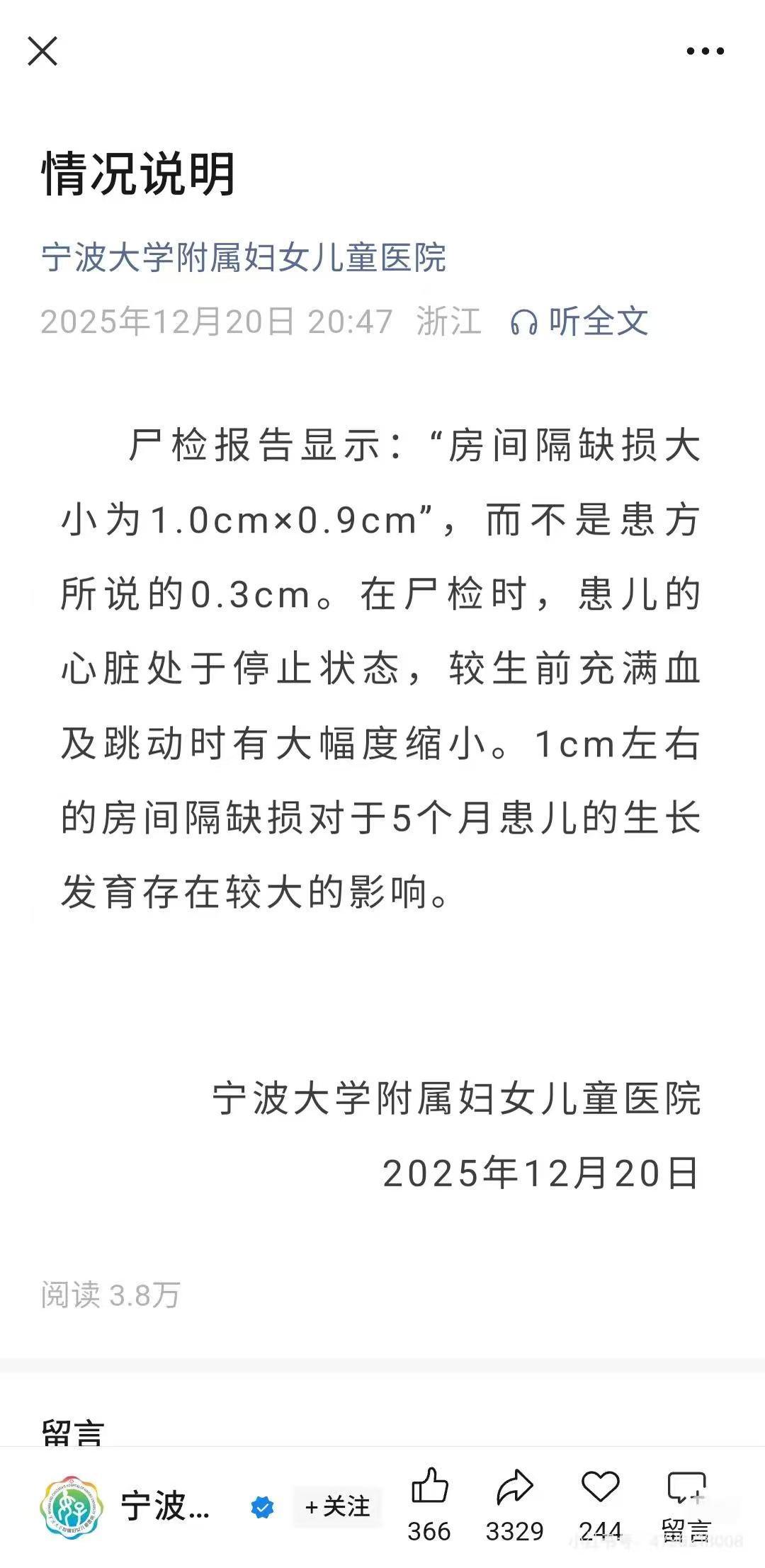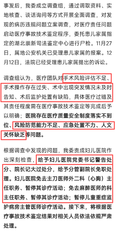 宁波卫健委回应小洛熙事件最新进展医疗事故发生以后的事,基本和医疗事件本身无关了,而是一场关于问责、追责、责任划定的博弈。这也是为什么宁波妇儿医院骚操作不断的原因。早在12月14日,宁波卫健委就通报并定性:风险评估不足、手术存在过失、突发情况未告知、术后监护有缺陷...处理也很严格:书记警告、院长记大过、副院长免职、免去一众当事医生职务。医疗事故的判定是非常专业且严谨的,宁波卫健委能如此快的定性和处理,且术前、术中、术后都认定存在过错,说明责任划分基本没有异议,医院方就是存在人为的重大失误,(哪怕有一点可能甩锅给意外事件、不可抗力,上级监管都都至于给这么严厉的、涉及手术全流程通报)。到这一步,宁波妇儿医院最佳的做法,要么是主动担责、尽力赔偿、弥补过错;要么就头铁的给出能推翻这份通报的无过错证据,当然大概率是没有的,如果真有早就拿出来了。但他们做了啥呢?先是莫名其妙的、冷冰冰的、毫无人文关怀的给出一份所谓尸检报告,而且全是专业医疗术语,无任何对公众说明解释的附加信息,看的大众不知所云,然后,又在1小时内紧急删除。这种前后矛盾、目的不明的骚操作,已经说明医院内部管理全乱套了,连对外发布重要信息这种事情,都非常随意发布、删除,无人拍板,无人负责,随心所欲。卫健委应解释小洛熙尸检报告小洛熙爸爸发解剖台画面被禁止播放