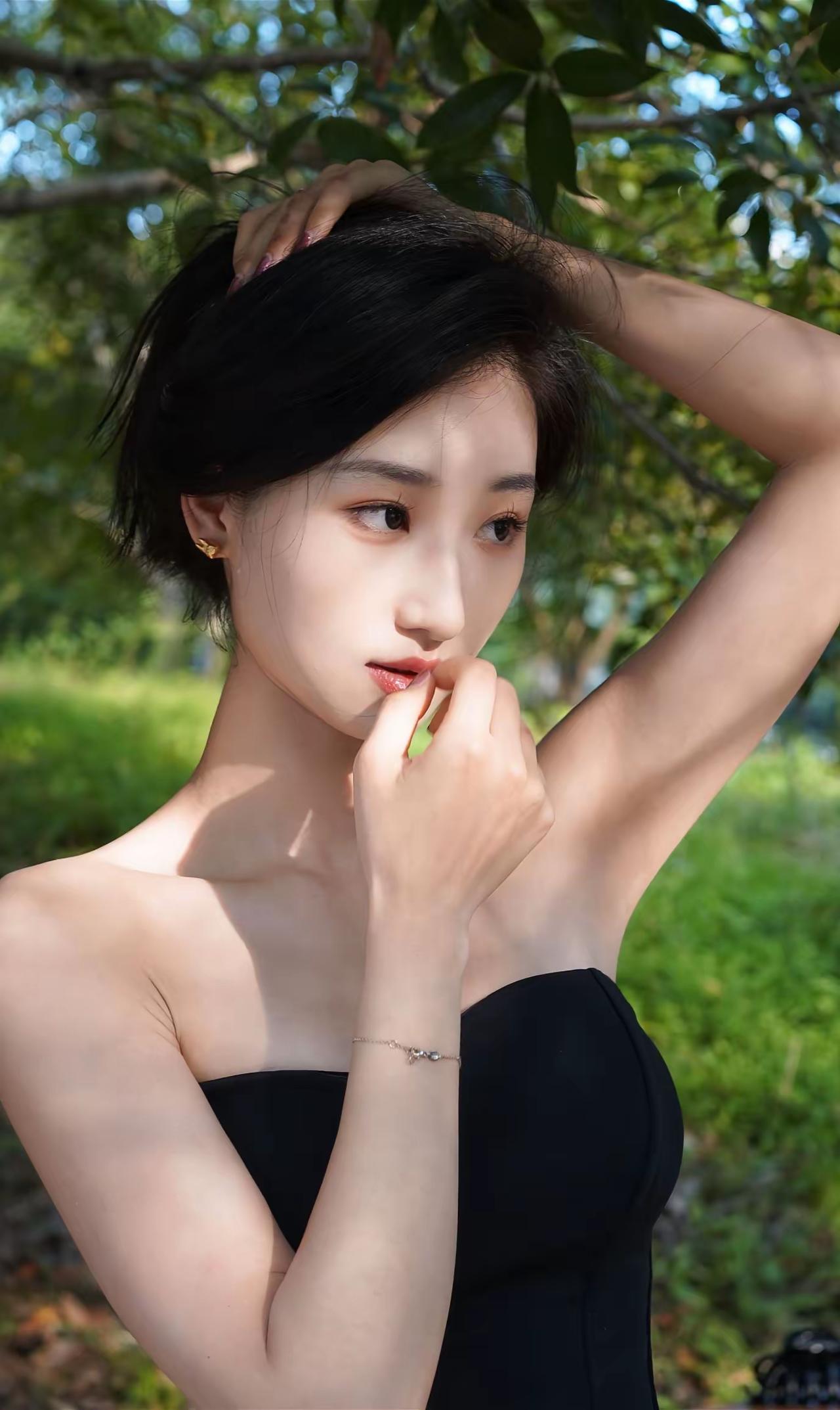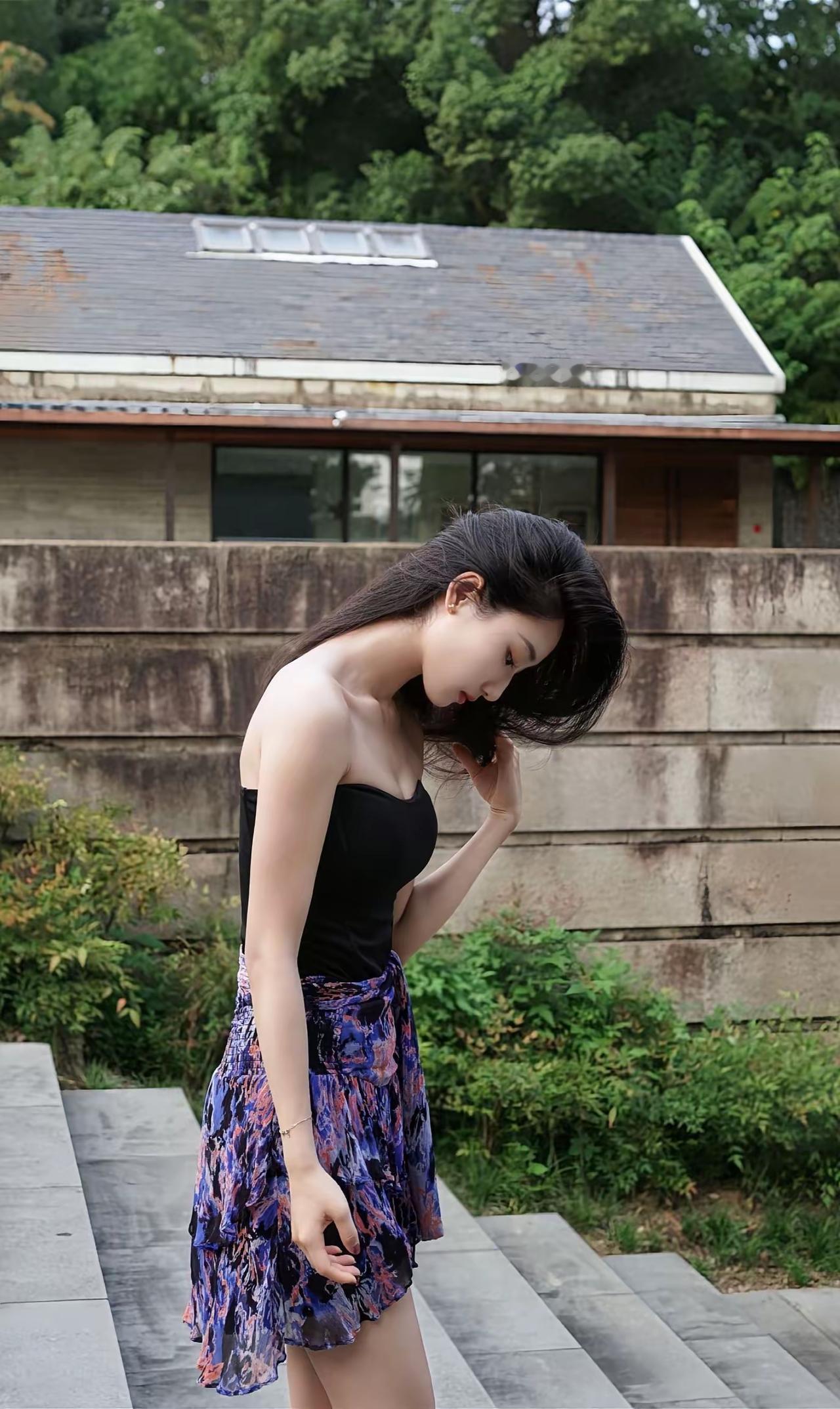 《墨裳花裙》原创诗词 墨抹香肩衬雪肤,紫霞裙袂曳阶除。 青丝漫卷风前影,素手轻抬鬓畔珠。 石磴闲依凝睇久,林光斜照入眉疏。 不须繁饰添妍丽,自有清姿压众姝。