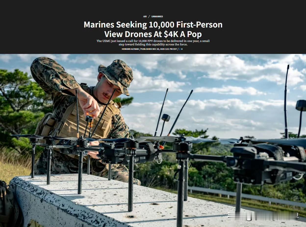 美海军陆战队计划采购一万架FRV,每架4000美元,好大的订单! 美国政府采购网站上发布信息称,美国海军陆战队正在寻找一家能够在2027年1月1日之前提供1万架无人机(FPV)的公司,每架无人机的采购价格为4000美元。 一年内交付1万架无人机,好大的公司! 老美是越来越搞笑,1万架无人机,还是在一年内交付,还得全美寻找这么一家公司。 你把这个订单发到华强北,就这个价,至少能给你整到2万架,不出一个礼拜就能给你打包邮寄到家。