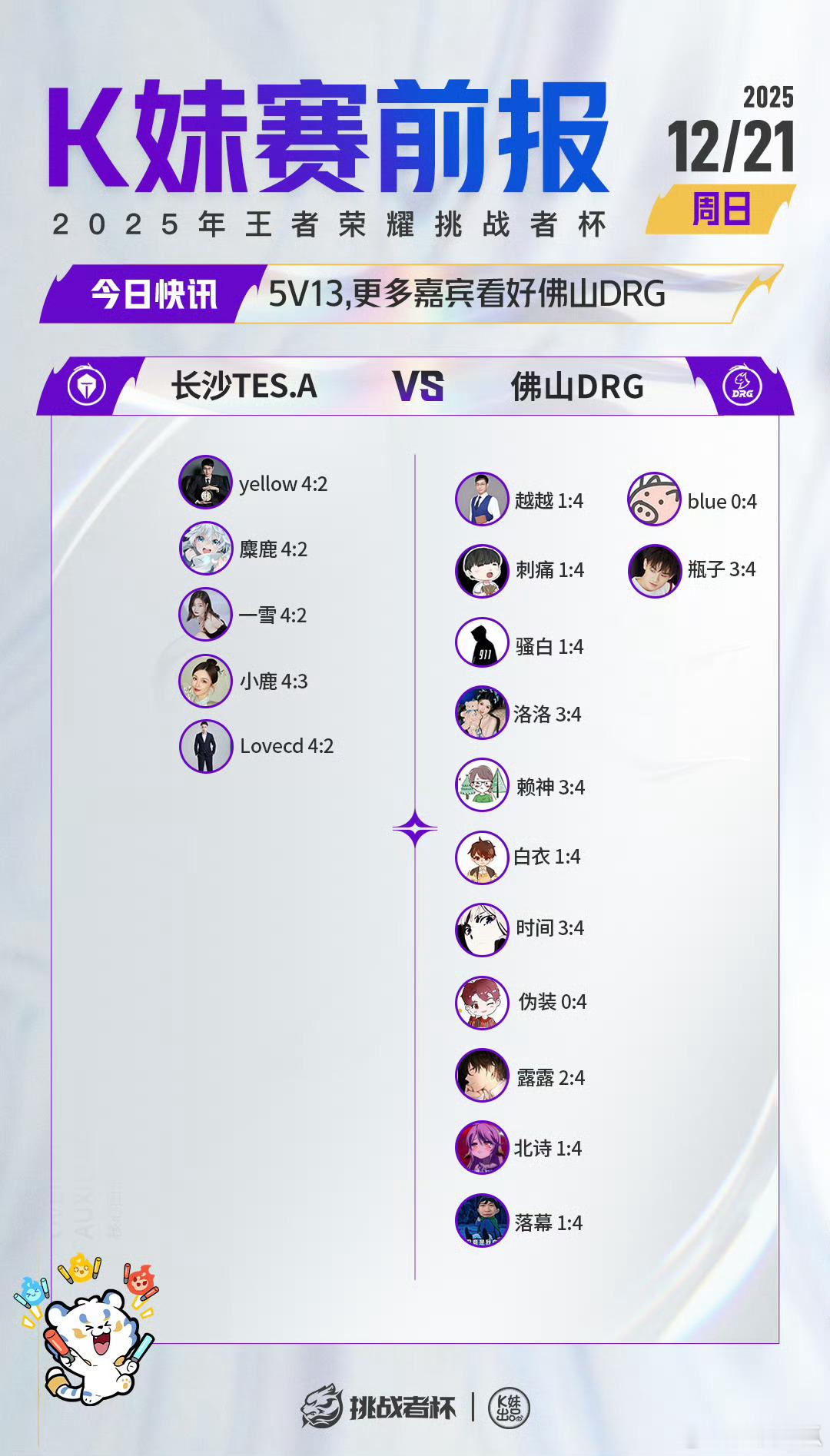 2025王者荣耀挑战者杯|K妹赛前报4v14,更多嘉宾看好成都AG超玩会;5v13,更多嘉宾看好佛山DRG