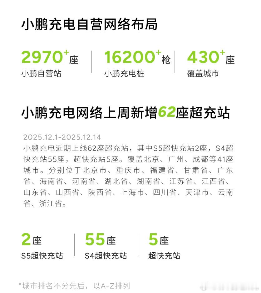 小鹏自营充电站即将突破3000座2025年第49和50周上线小鹏超充站62座。截至目前,小鹏充电自营网络布局共有2970座直营站、16200枪充电桩,覆盖城市430座,用户平均3公里内即可触达自营站点。