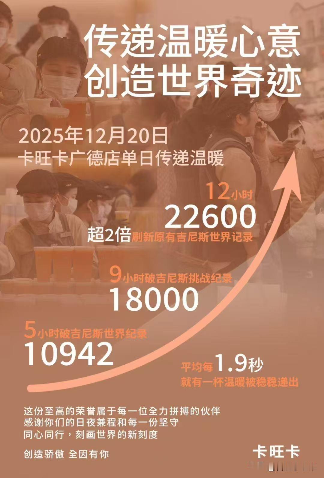 12月20日,安徽本土奶茶品牌卡旺卡在广德店的吉尼斯挑战燃爆全场!12小时狂卖22862杯现制饮品,直接超两倍刷新2020年上海斟茶记10942杯的原纪录,平均每1.9秒就卖出一杯,堪称“奶茶界速度与激情”! 这场逆袭早就有迹可循——凭借桂花鲜奶、板栗麻薯等“广德三件套”圈粉无数,此前就引得上海、南京游客跨省打卡,甚至出现288元闲鱼代购的热潮。为接住流量,品牌紧急从合肥抽调20余名员工支援,30人团队火力全开,用实力回应全网热爱。 从街头巷尾的本土味道,到冲出安徽的世界纪录,卡旺卡用极致性价比和地道风味征服消费者。这波属于安徽品牌的高光时刻,必须狠狠点赞!👍