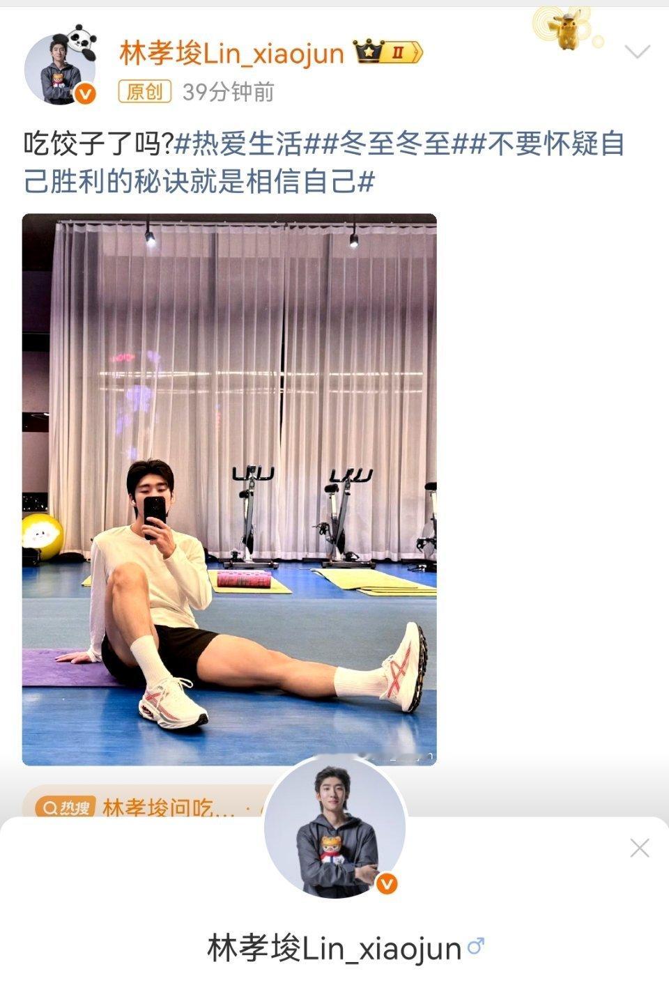 今天是冬至,北方人习惯吃饺子。林孝埈微博账号发布"不要怀疑自己,胜利的秘诀就是相信自己"的博文,并配文"吃饺子了吗?"