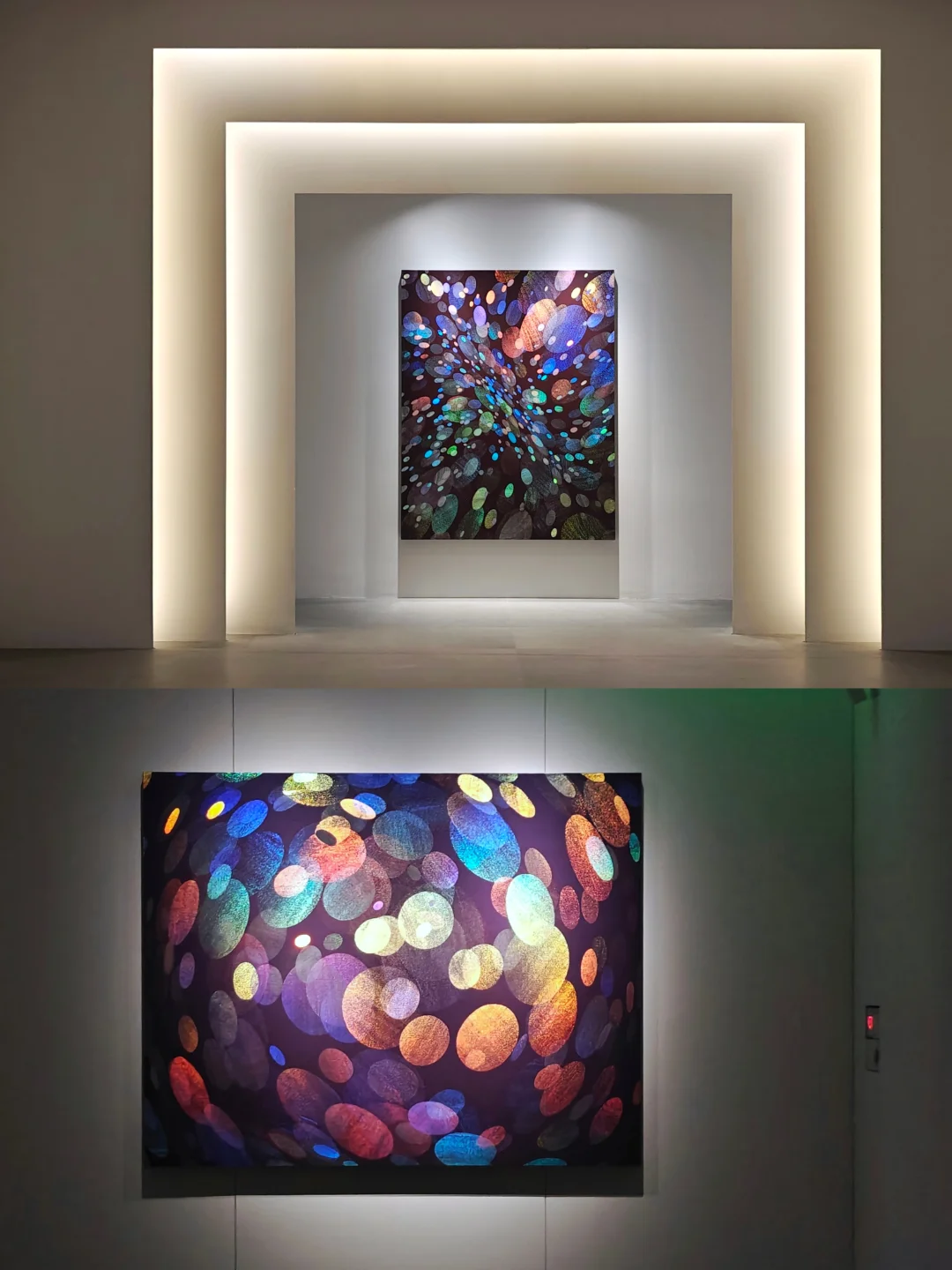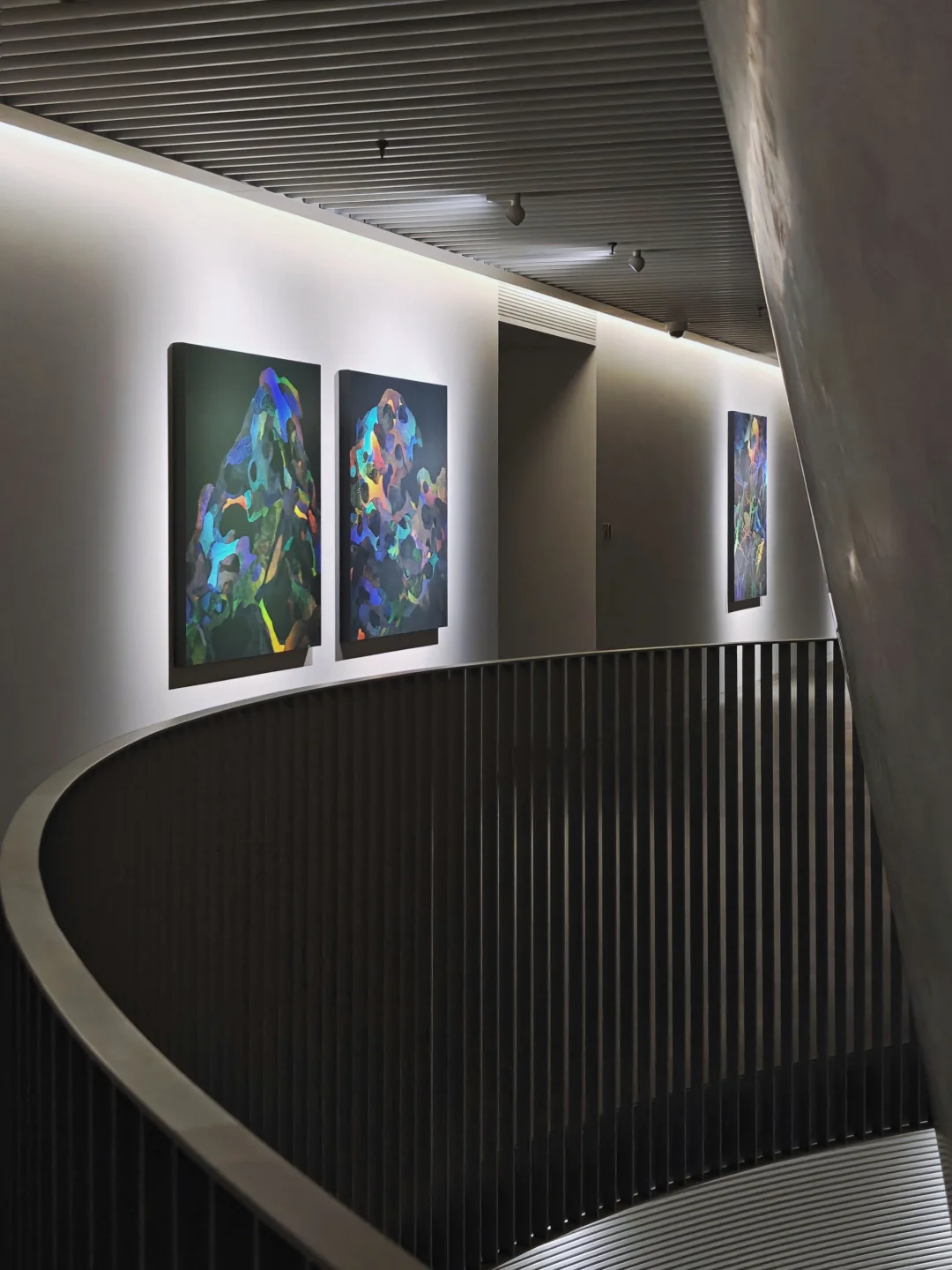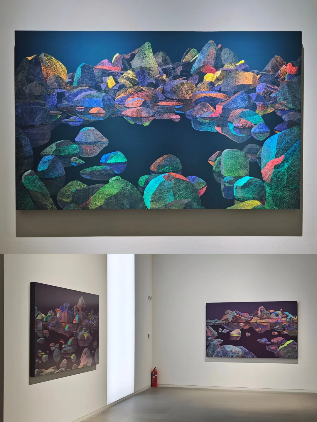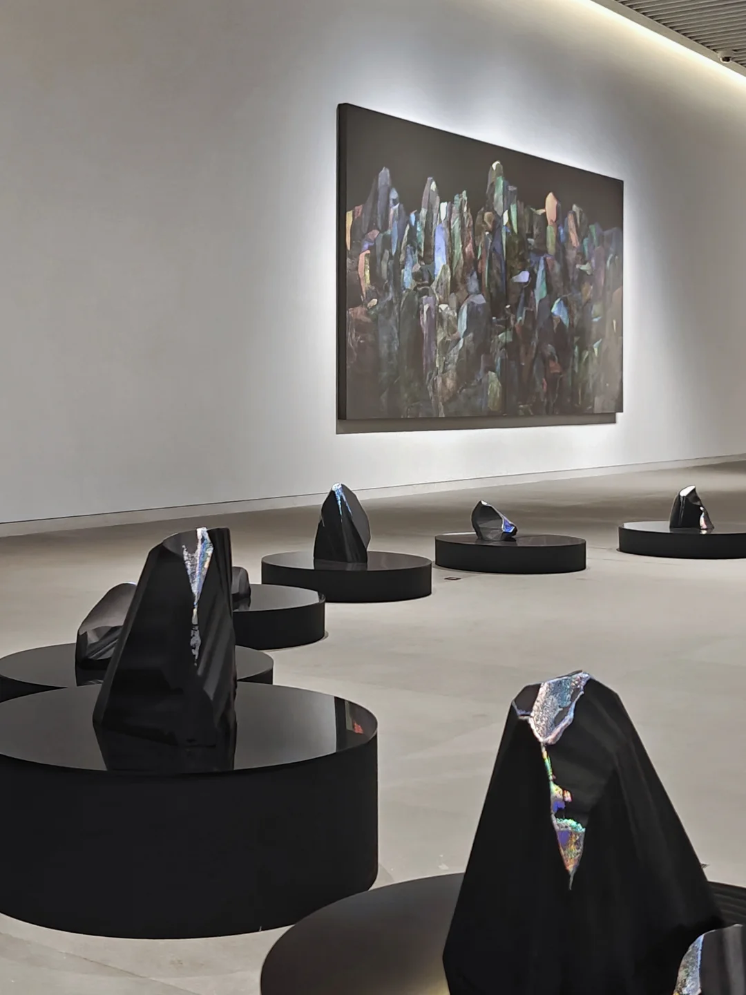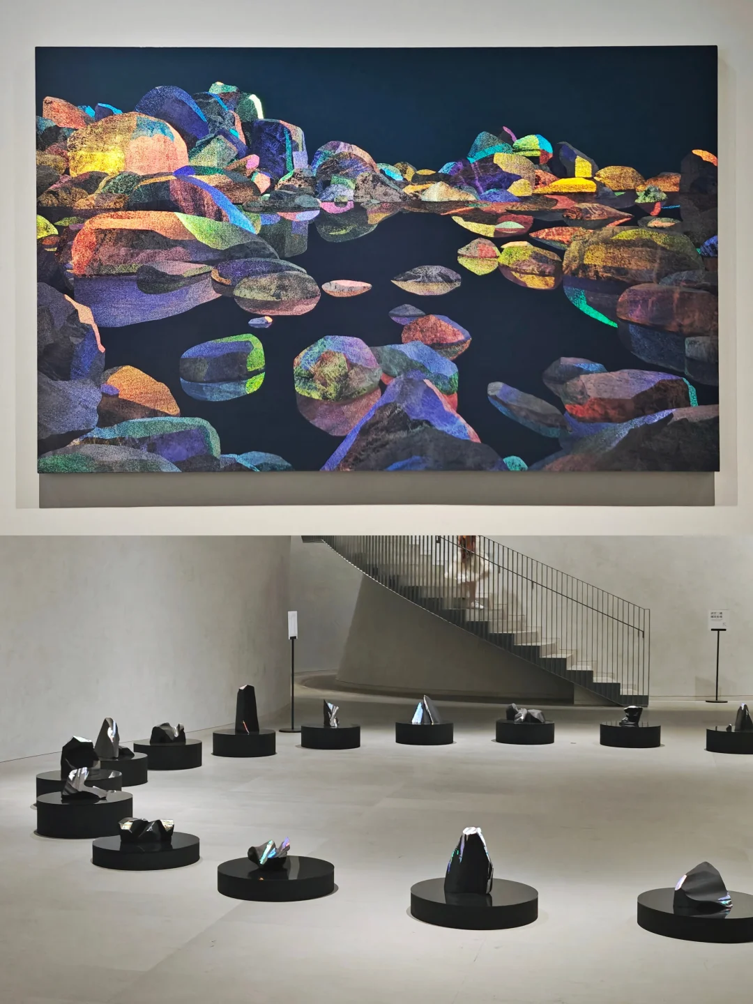 褶曲其中\n📆5月25日🔚\n🕙周二至周日10:00-17:00;周五延长至21:00\n📍震旦美术馆 富城路99号\n👨🏻\u200d🎨黄喆\n🎫39\n\t\n🖼️展览系统梳理了艺术家近年创作脉络,集中展现其从考古学方法出发,融合天体物理视角,通过综合材料创新构建的时空对话场域。作品既包含对历史碎片的考古式回望,也展现对宇宙秩序的哲学思考,形成独特的\"力量诗学\"表达体系。\n🖼️艺术家有着雕塑专业背景,对肌理、自然材质有着非常独特的敏感度。他的作品时需要移动观看,因光线折射的角度不同,让画面的色彩不断变化,整个画面是富有流动感的。\n\t\n🪨《撰石》系列\n通过山石与星象符号的并置,以综合材料重构远古人类认知宇宙的原始视觉系统。\n🪨《轴心》系列\n在材料层叠中构建细胞分裂式结构,对应雅斯贝斯\"轴心时代\"理论中人类精神的觉醒进程。\n🪨《千寻》系列\n基于宋代赏石文化,通过不规则形体与空间穿透性设计,拓展传统文人石的当代形态表达。\n🪨《蓝移》系列\n利用色彩频率变化模拟天体运动中的蓝移现象,探讨人际引力与空间压缩的物理-情感关联。\n🪨《漂浮》系列\n以非规则几何形态呈现土星小卫星的观测图像,表现游离于主流引力系统之外的物质存在状态。\n🪨《无量的瞬息》系列\n通过岩石剖面结构的物质转化,记录地质时间尺度下内外应力作用的可视化痕迹。\n🪨装置《隐力》系列\n用易逝性材料模拟土星光环内卫星的消逝轨迹,探讨存在痕迹与记忆存续的时空关系。\n🪨装置《极深场》系列\n将哈勃深空观测数据转化为空间装置,在星系演化史与人类个体生命史之间建立可视化的时间维度对照。\n\t\n💗关注我,每天带你免费看展💗\n