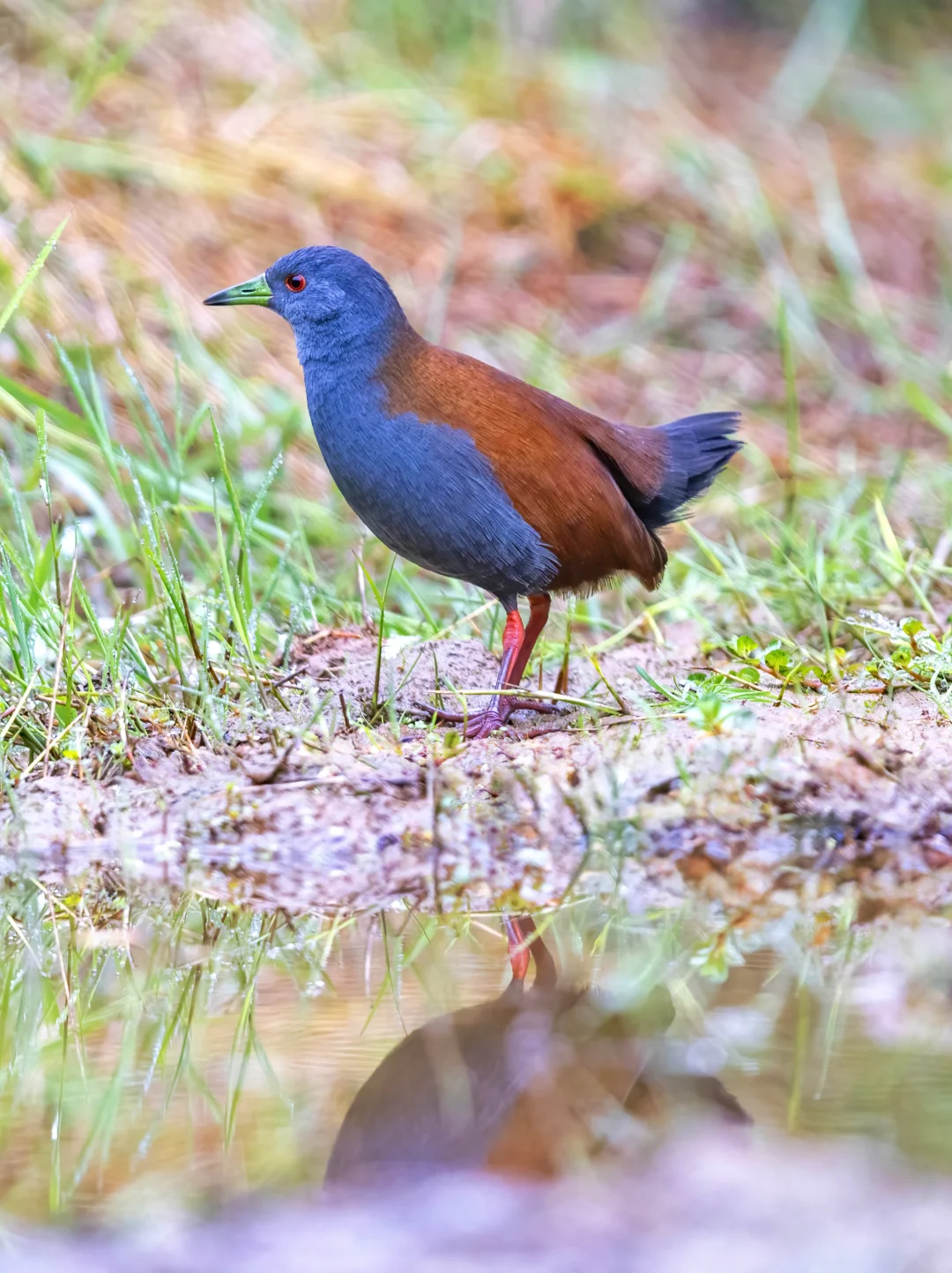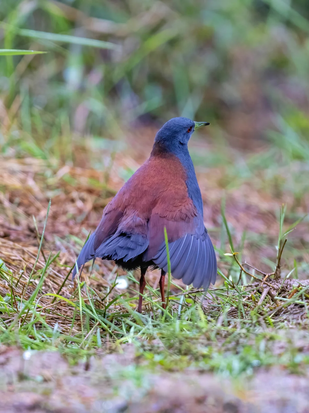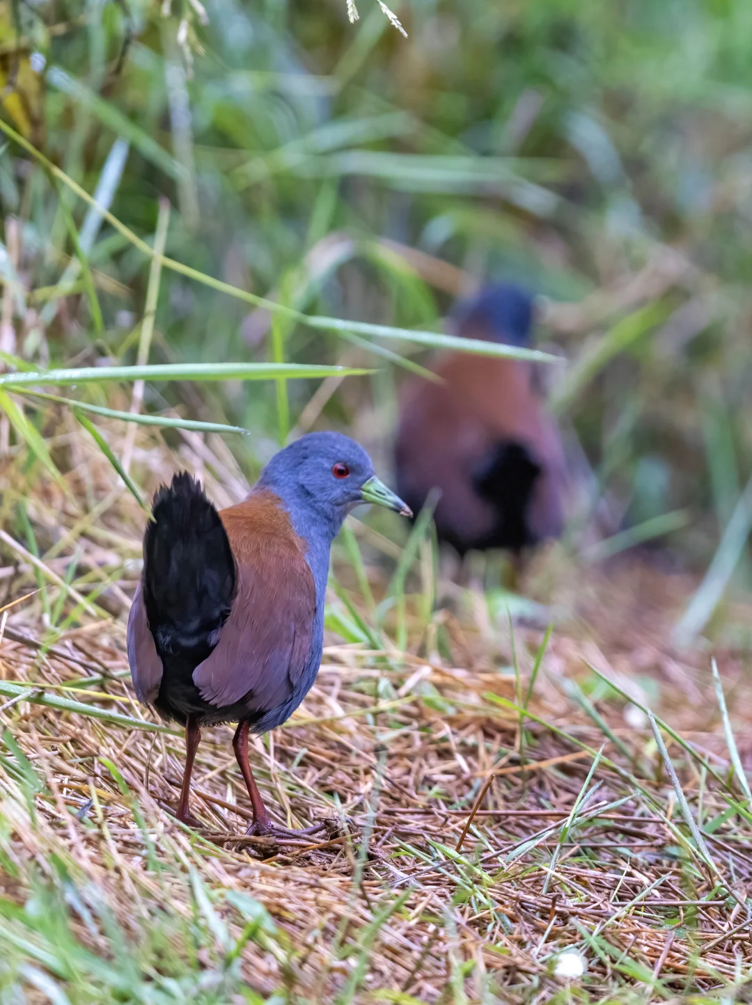 原创拍摄于2024.12 棕背田鸡,鹤形目秧鸡科小田鸡属。继承了田鸡秧鸡的害羞体质,擅长在田里隐匿的小家伙。棕背田鸡颜色很独特,北部是红棕色,头颈和下体是蓝灰色,尾巴黑色,整个撞色拼接。 棕背田鸡分布在喜马拉雅山脉东部到中国西南地区,延伸到东南亚,在我国云南广西少见,广东也是偶见。加上胆小擅长隐匿,平时就更难观察了,不然生活在田里很容易被抓住的。这两只在广西看到的棕背田鸡就是在天蒙蒙亮的,光线还很暗的时候就出来觅食,还非常谨慎,不肯多待,不过还好见上了一面。
