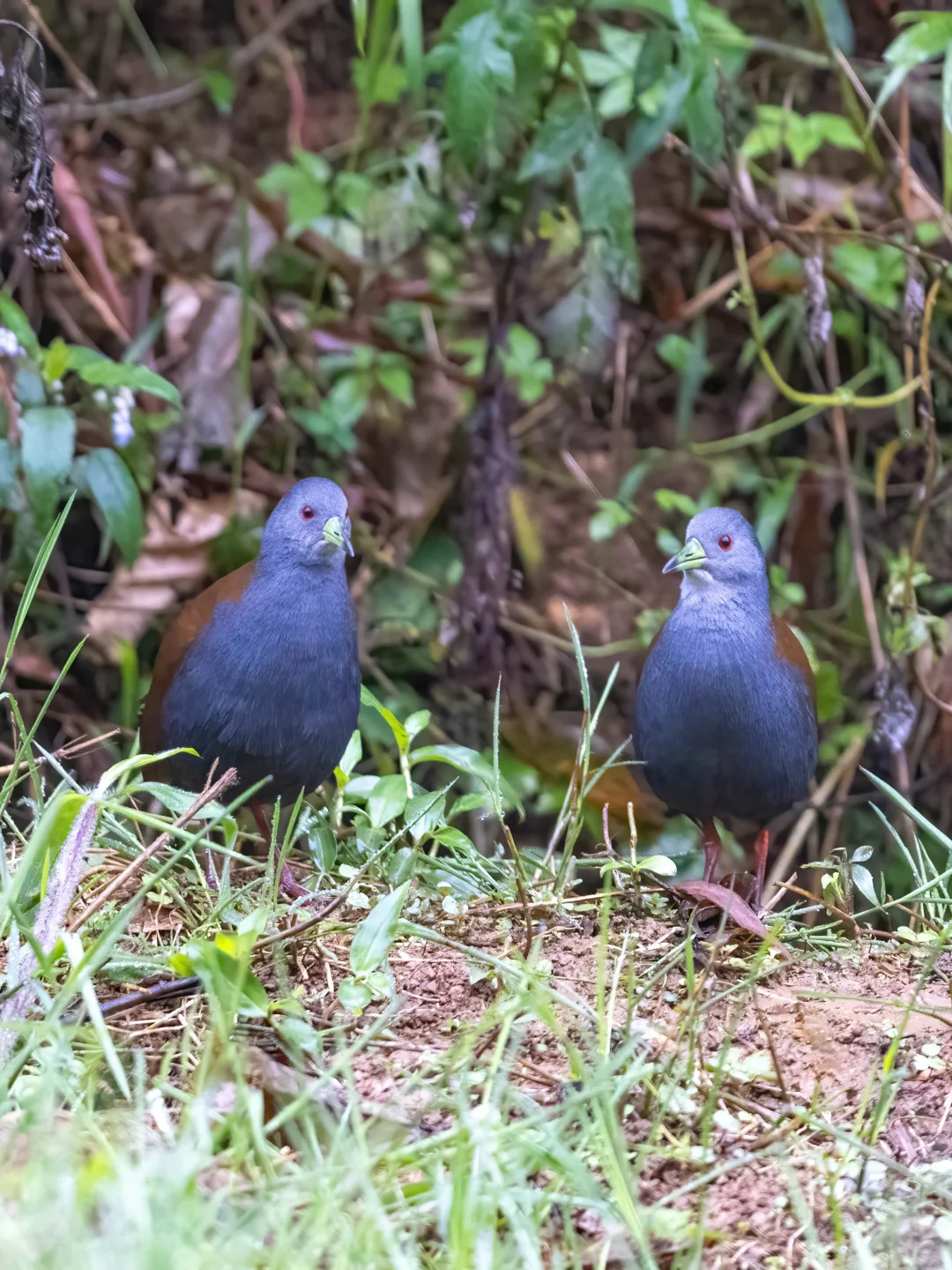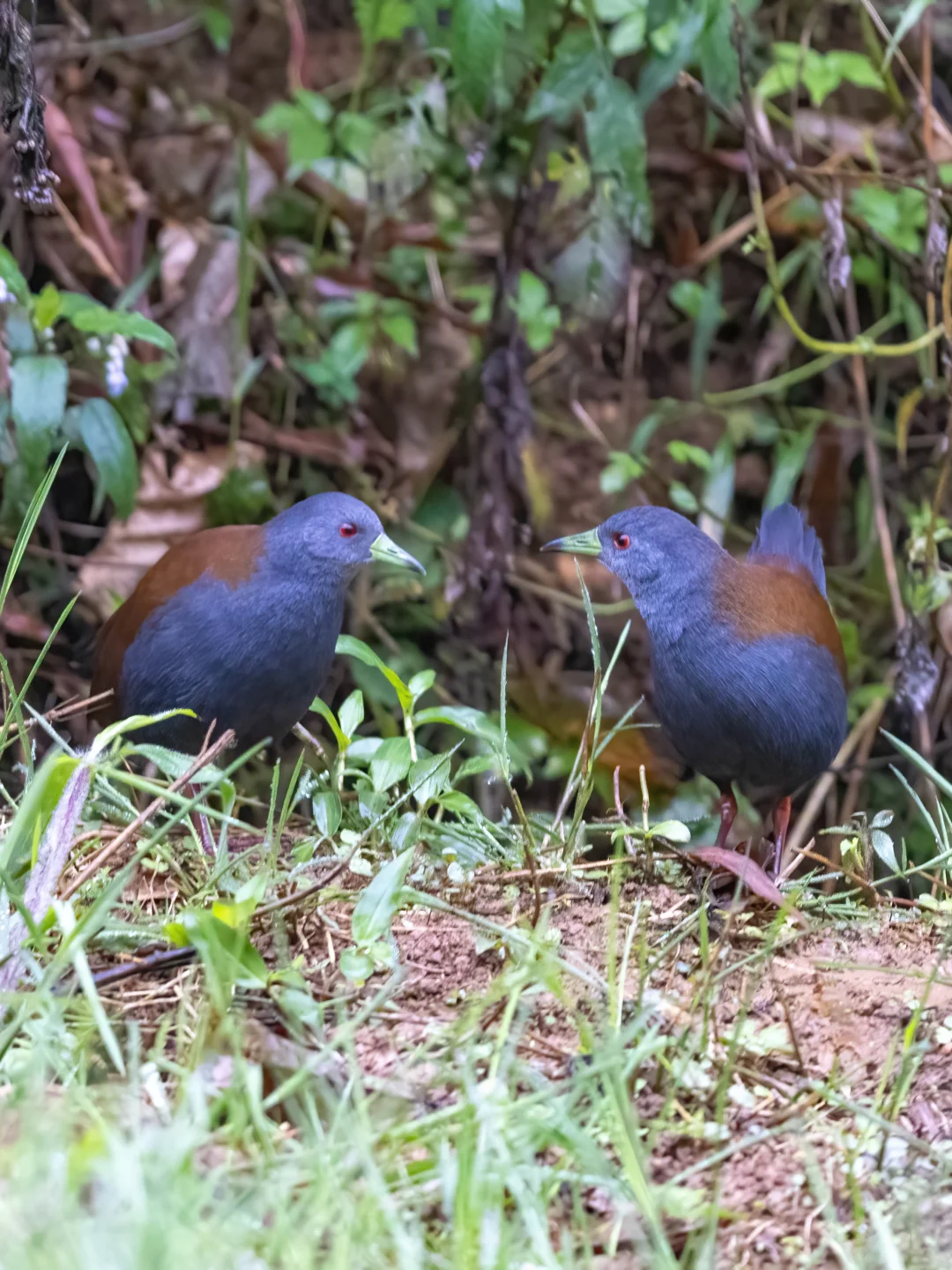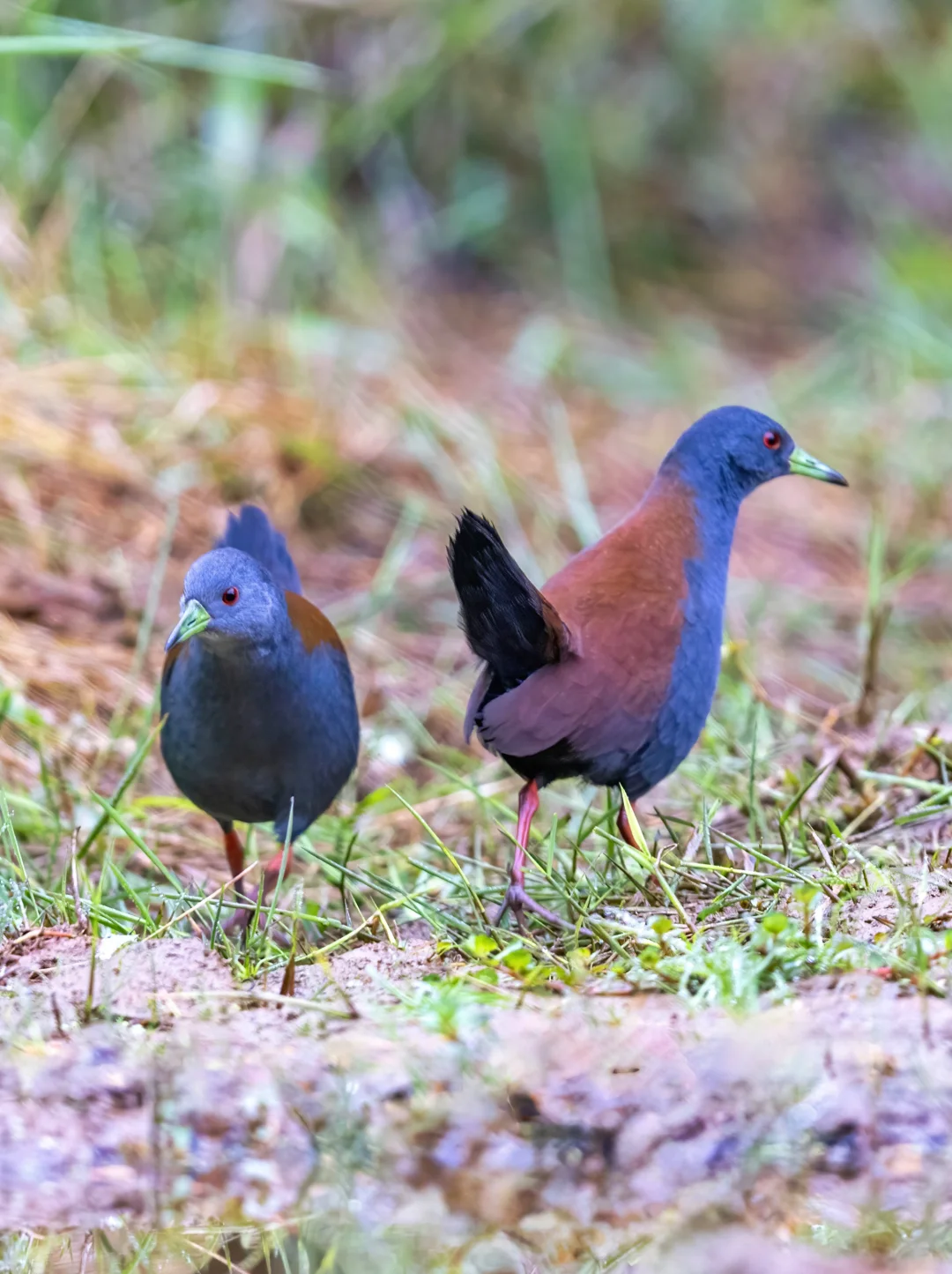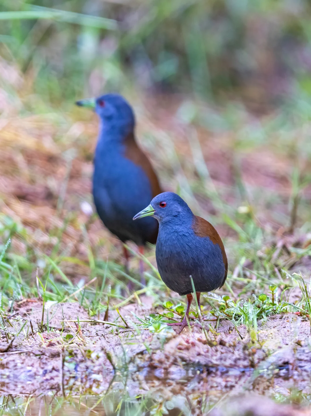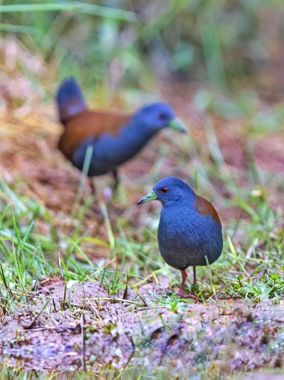 两只隐匿的棕背田鸡趁天没亮出来觅食