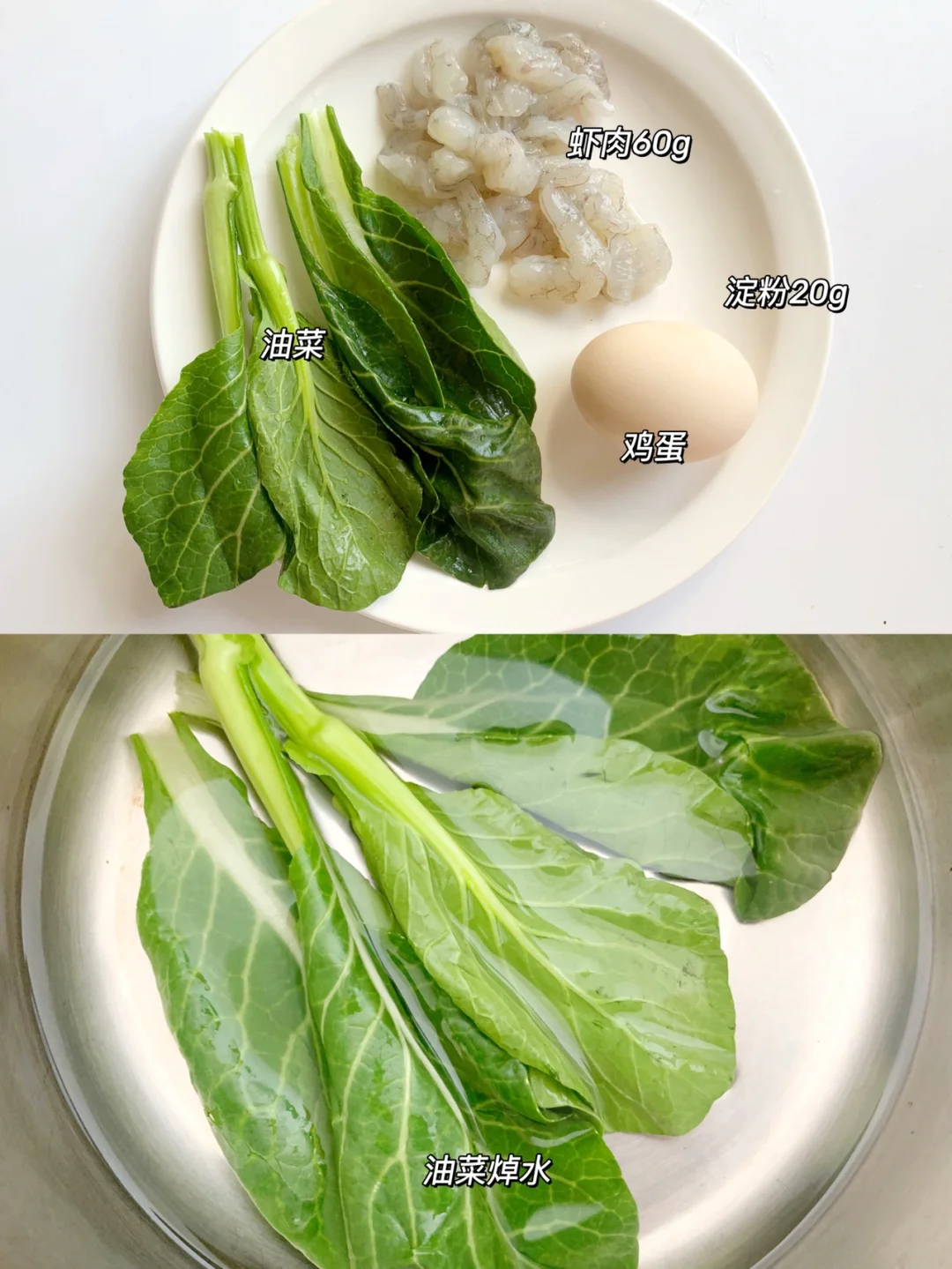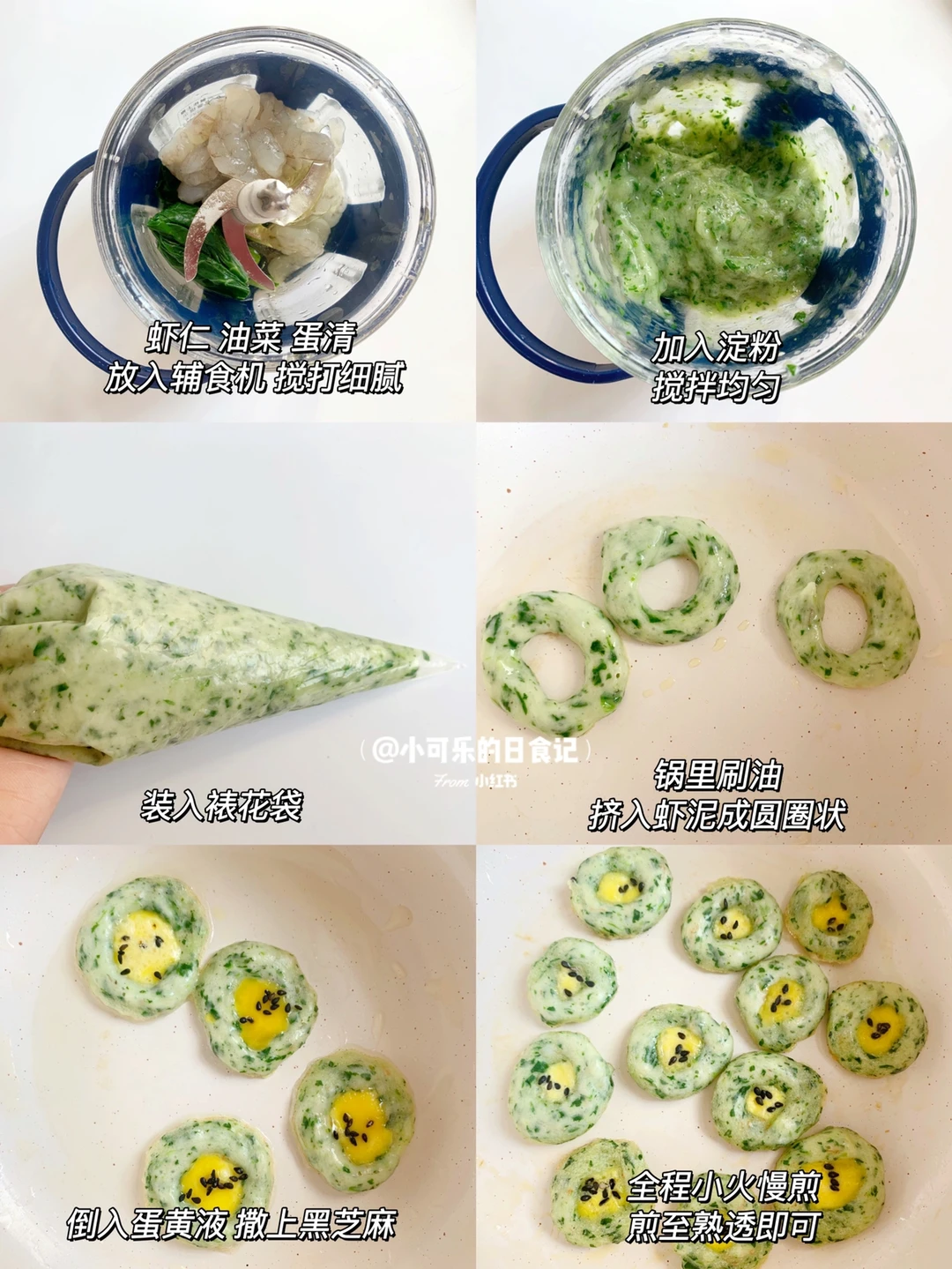 1⃣️油菜焯水,虾仁,油菜和蛋清放入辅食机搅打细腻,加入淀粉搅拌均匀,装入裱花袋