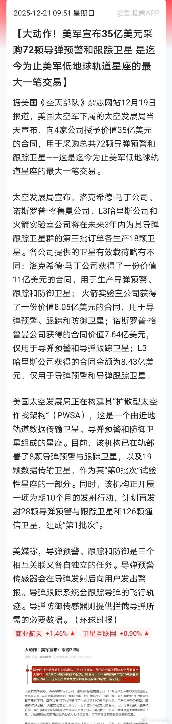 周末商业航天板块热度非常高,这已经是连续4个周末这么火爆了。这个题材很像年初的机器人,很有机会成为跨年的主线!周五美股商业航天也大涨。有两个新增量:第一、美国总统特朗普签署行政令,要求采取加大研发和吸引私营部门投资,确保美国的“太空优势”。第二、美国宣布,向4家公司采购72颗导弹预警和跟踪卫星  价值35亿美元 ,这是老美低地球轨道星座的最大一笔交易。国内也有新的催化,12月21-23日将举行文昌国机航空航天论坛;12月24日中国商业航天发展大会将在中关村举行。可能都会有大招放出来!总之,商业航天宏大叙事很强,又是万亿产业,又是中美太空争霸,最近也有一些订单在落地!这不仅关乎产业发展,更关乎国家太空层面的安全。故事是非常性感的。但目前看,商业航天还处于概念阶段,大部分公司还没有业绩。短期涨幅也较大,这种产业板块行情是一波一波涨的,龙头也容易变换大王旗!大家注意好节奏。