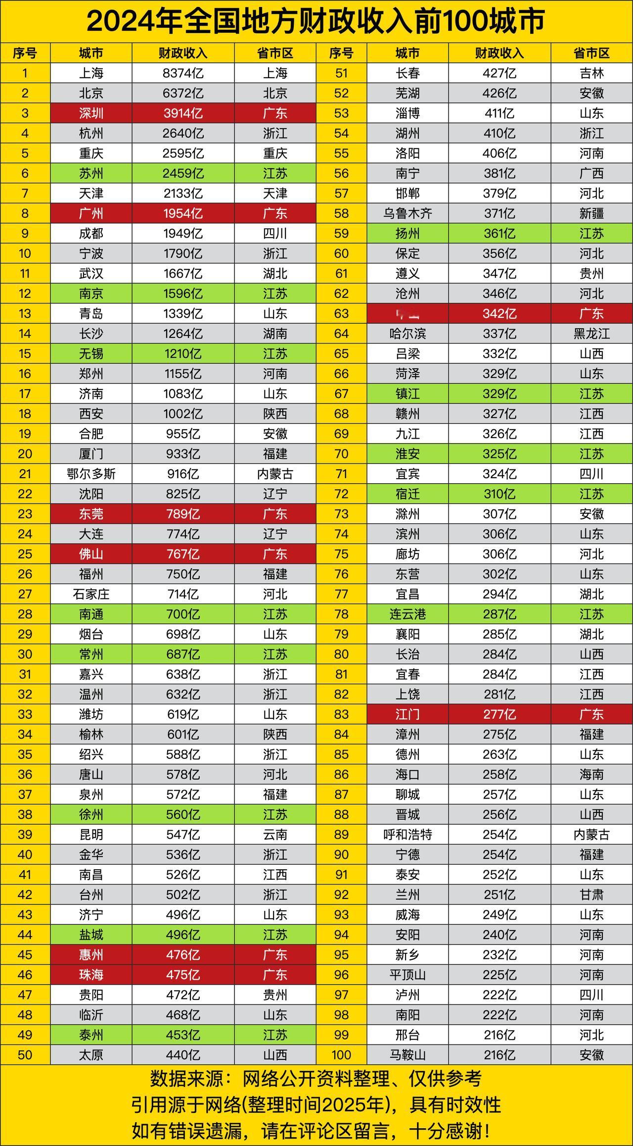 上海一骑绝尘,8374亿的财政收入,稳坐老大宝座。这就好比是班里的学霸,每次考试分数都高得让人仰望。北京也不差,6372亿紧跟其后,跟上海一起领跑全国。这两座城市,那就是中国经济舞台上的超级巨星,聚光灯下闪闪发光。深圳也相当厉害,3914亿的收入,作为改革开放的前沿阵地,那是一路小跑往前冲,活力满满。 再瞧瞧中间这一大波城市。杭州、重庆、苏州这些个新一线城市,财政收入也都相当可观。它们就像是班级里的尖子生,成绩稳定又出色,在经济发展的赛道上你追我赶。不过呢,这里面也有点小插曲。你看,有些城市明明实力不俗,财政收入却和前面几位差了一大截。就像是在跑步比赛里,前面的选手已经跑出去老远,后面的选手虽然也在奋力追赶,但差距不是一时半会儿能缩小的。 然后还有些城市,财政收入相对就没那么亮眼了。像一些中西部城市,排名比较靠后。但这也不是说它们不行,每个城市都有自己的发展节奏嘛。就好比跑步,有的起跑快,有的后程发力。说不定哪天,这些城市找到了适合自己的发展道路,就能像黑马一样,一下子冲到前面去。比如有些城市有着丰富的自然资源或者独特的文化底蕴,只要好好开发利用,未来的发展潜力那是杠杠的。 总的来说,这份榜单反映出了中国城市经济发展的现状。有领先的城市继续领跑,也有城市在努力追赶。经济发展就像一场没有终点的马拉松,每个城市都在为了更好的未来拼命奔跑。咱就等着瞧好吧,看看接下来这些城市都能整出啥新花样,给咱带来啥惊喜!不管是经济强市还是正在崛起的城市,都值得咱关注,毕竟它们都是中国经济版图里不可或缺的一部分呢!