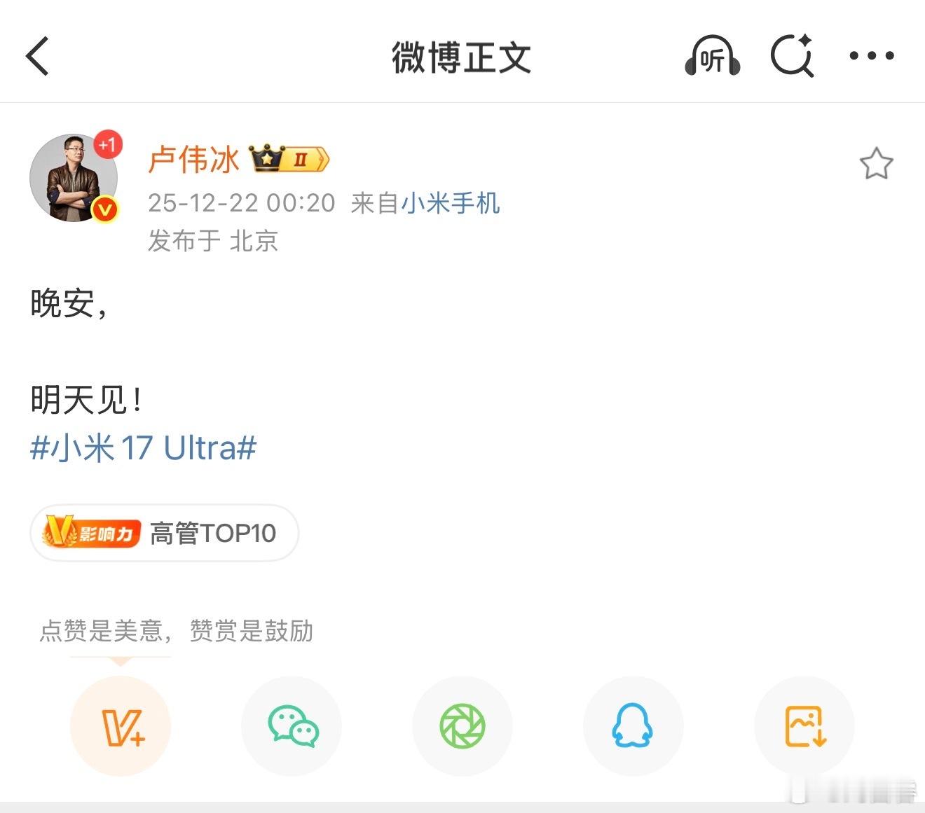 卢总发博「明天见!」看来是要正式预热了?大家期待17Ultra吗?想看