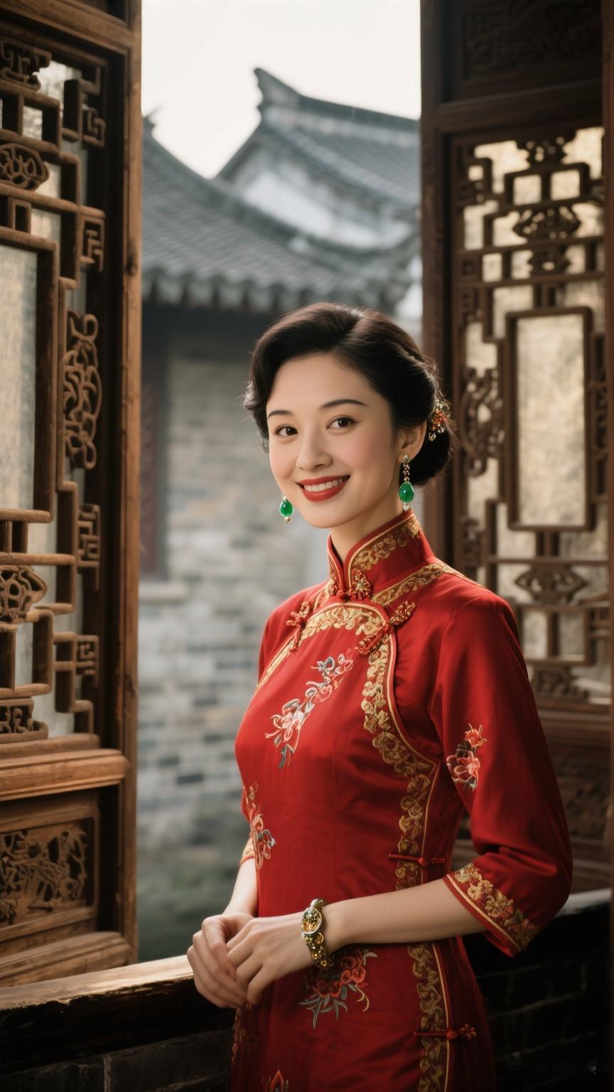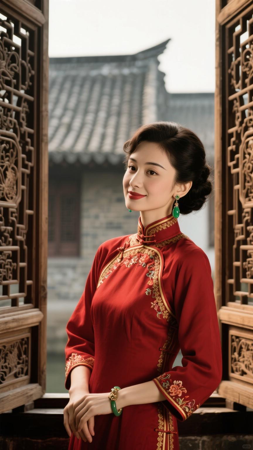 美女身着红色中式旗装,绣花精美,翡翠耳坠点缀,古建门窗背景朦胧,光影柔和,古典宁静。