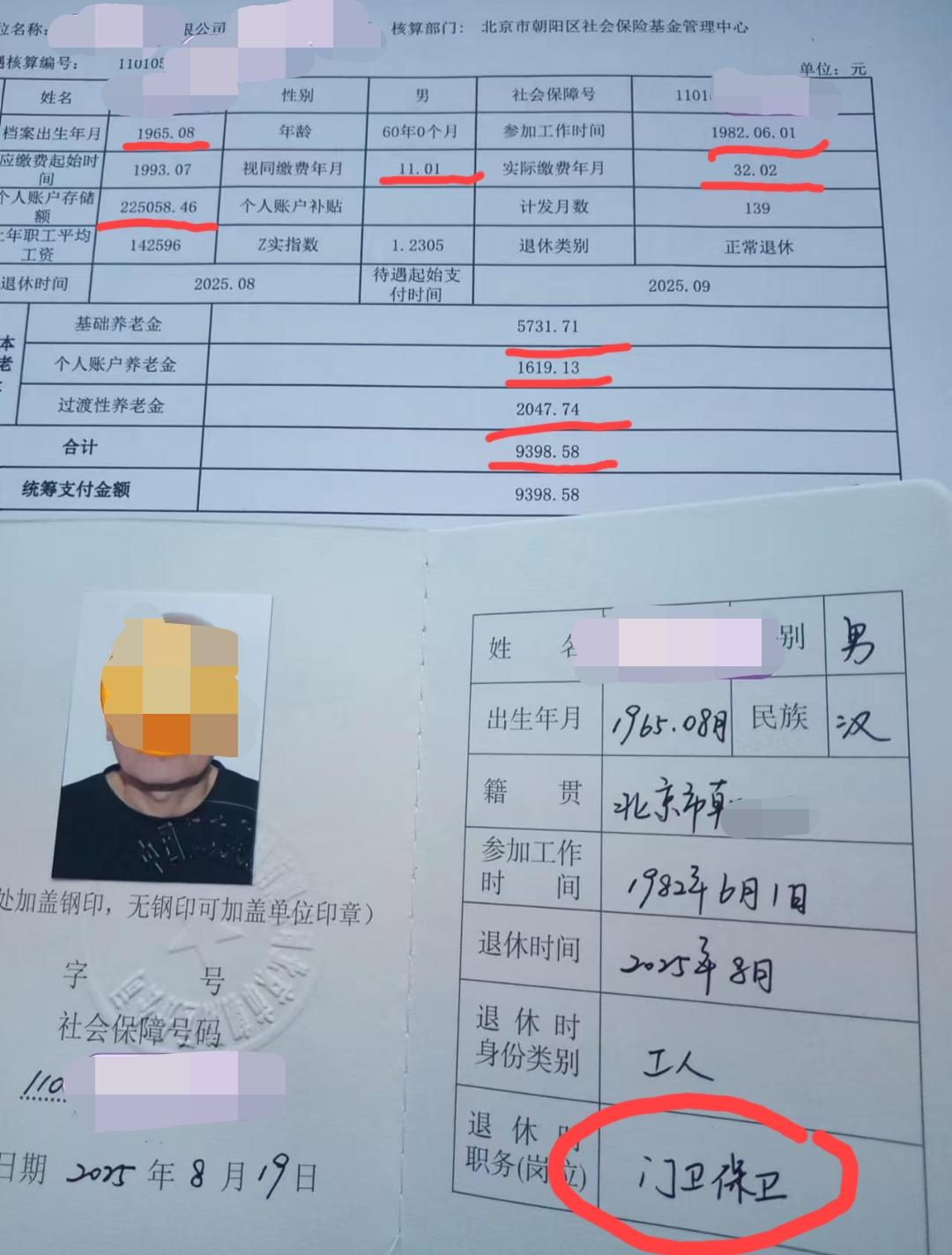 北京某央企退休职工养老金核定表,大家觉得如何? 这位大哥65年生人,82年参加工作,这样看的话,学历应该不是很高。最后的工作岗位是门卫保卫。实际缴费年月32年,视同缴费11年,个人账户225058元。目前可领取养老金9398元,其中基础养老金5700,过渡性养老金2000多。 小编:不是说央企的退休工资很高的吗?我看也不过如此嘛,我们这边就普通企业的退休职工,而且还没到40年,而且后面20年是下岗的,是自己交的养老金,也有7000多。