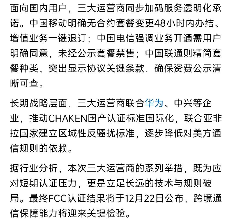 移动关停2.1万余条违规中继线路,切断非法跨境通信渠道;骚扰电诈的技术源头终于现身了。有网友发文说,距离美国联邦通信委员会(FCC)12月22日RMD认证整改截止日仅剩一天,移动、电信、联通三大运营商同步推进技术合规、跨境通道备份与服务升级承诺,以应对外部断联风险,保障跨境通信稳定与民生服务质量。 原来防止电诈一点也不难啊,存取款防诈成了一道枷锁,106开头的号码是谁发放的。要比回应美要求落实整改举措一样-“承诺实现虚拟号段跨境骚扰电话拦截率≥99%”期盼切实加强对运营商的监管,解决国内同样的问题。 到底是谁在作怪还是睁只眼闭只眼,来坑害国人,难道举国上下都不知道这三大通信营运商之高明吗?为啥外国说话挺好使呢?天大之笑话。为什么外部压力上来后,我国电信运营商才自查自究,纯是坑国内老百姓企业,让消费者怎么相信国内企业诚信和可信度?看来,西药疗效远胜中药。 这次从内心感谢老美。要不是老美怎么能使那么多的骗子无路可走?可见国家应该真正打去的电诈后台是谁了!移动通信运营商 移动通讯运营商 3g基站撤网 通信屏蔽 电信跨境专线 非法信号基站 移动中继