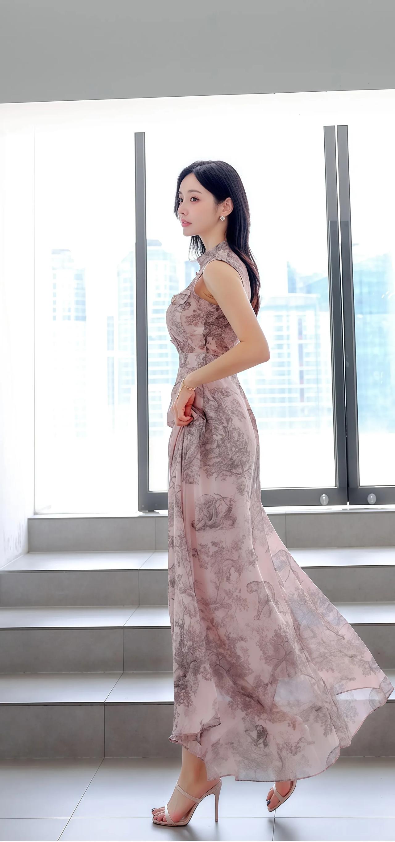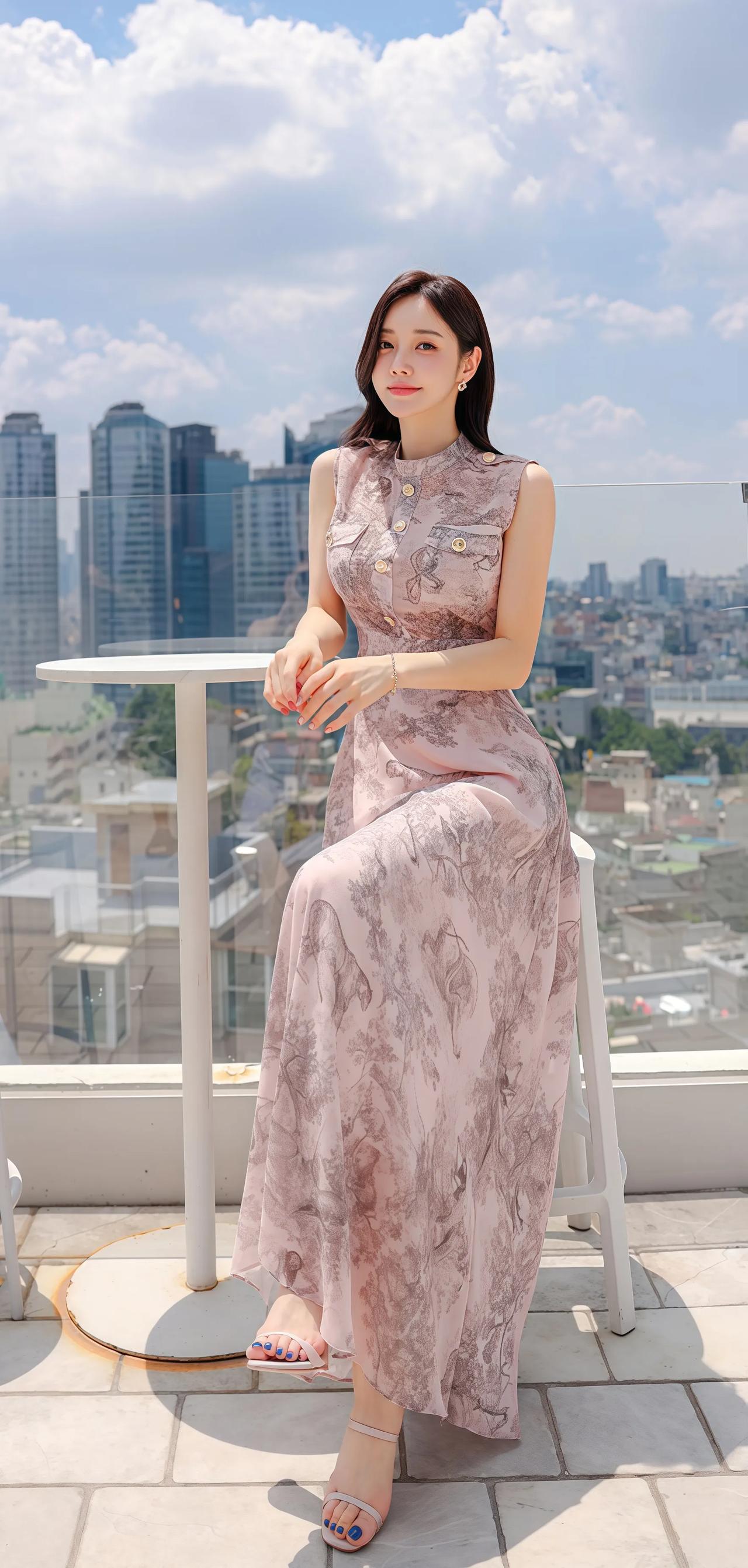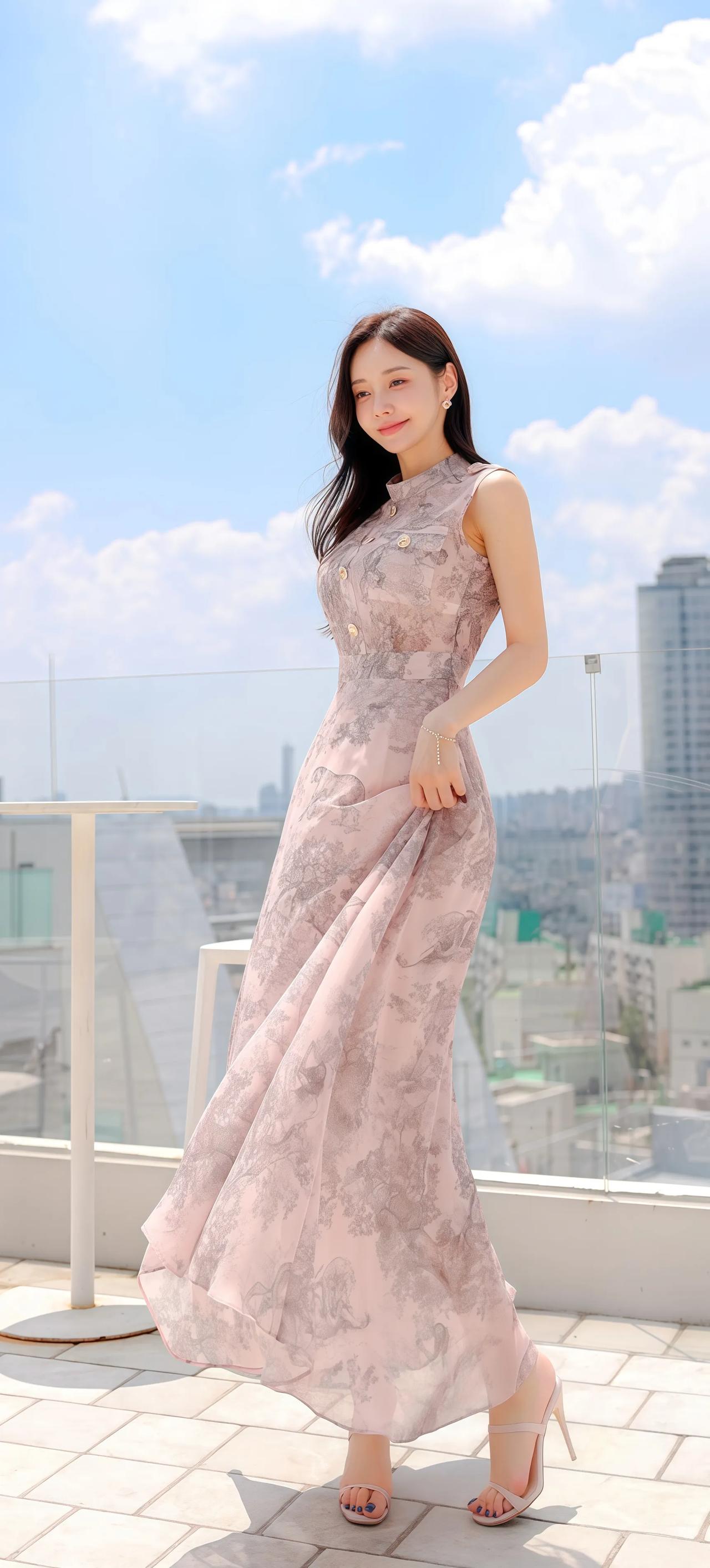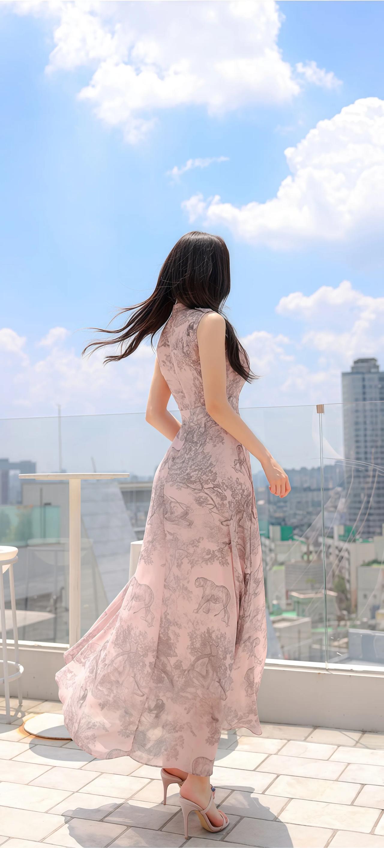 优雅气质,粉色印花长裙,都市天际线下的时尚穿搭