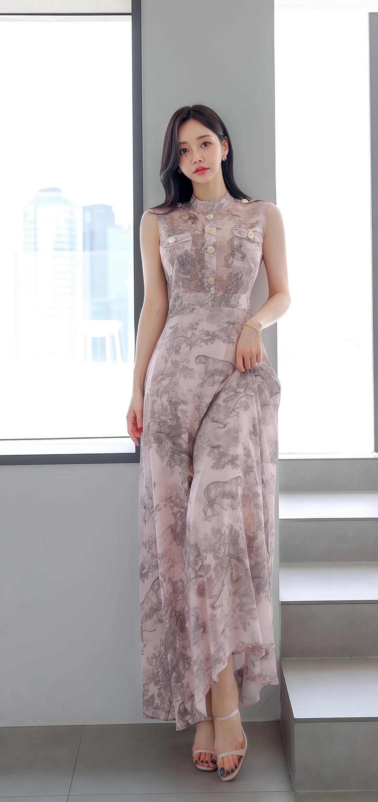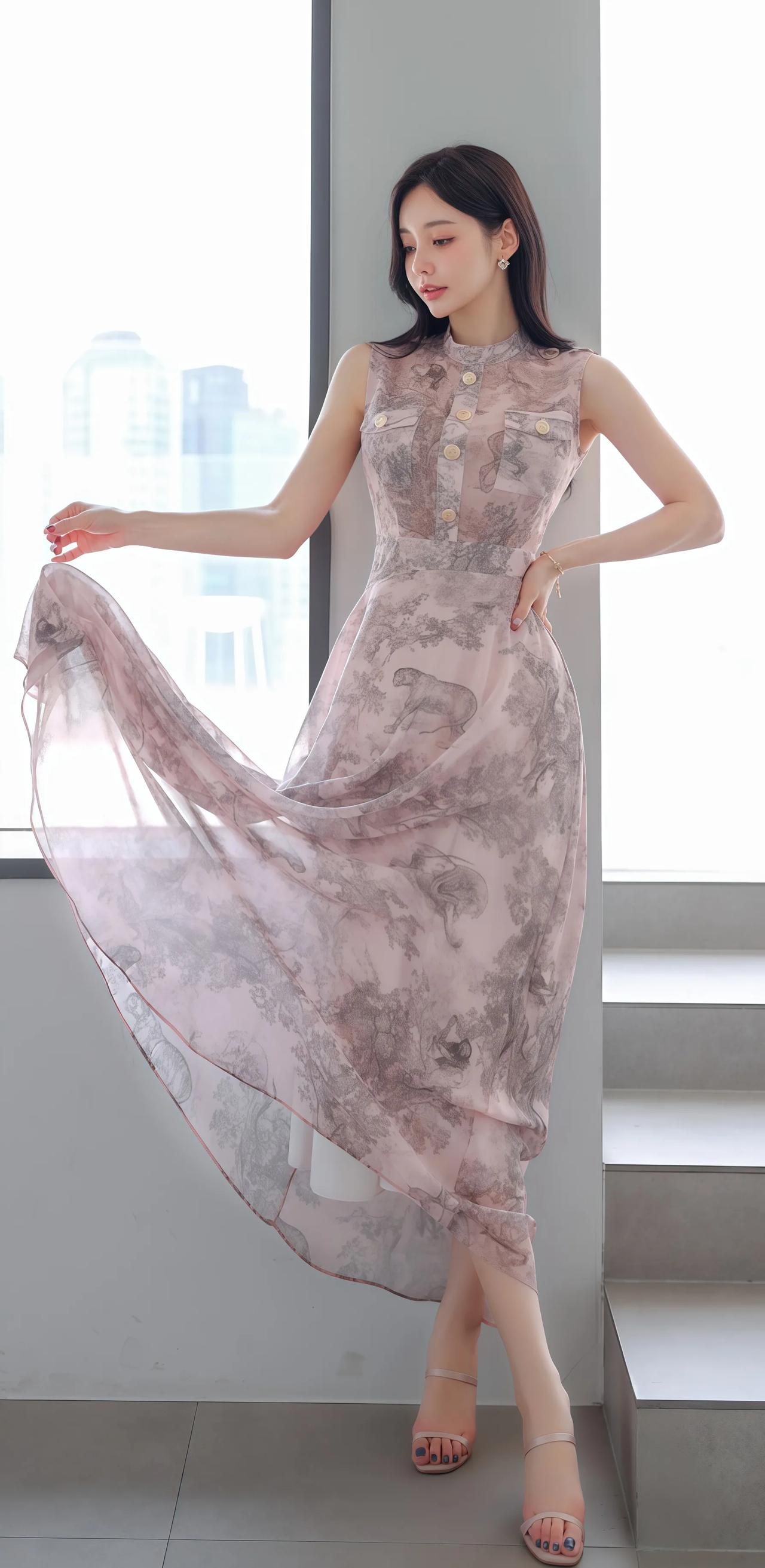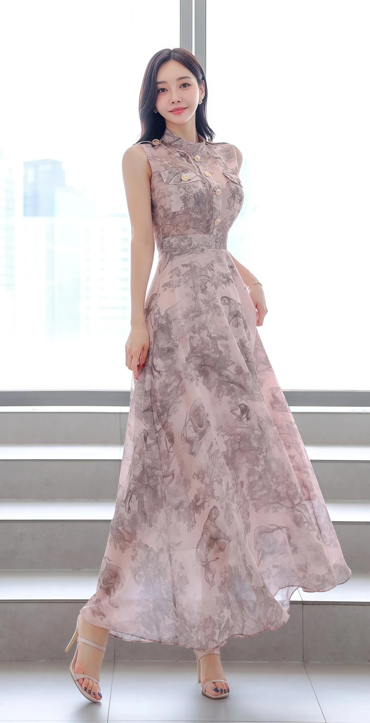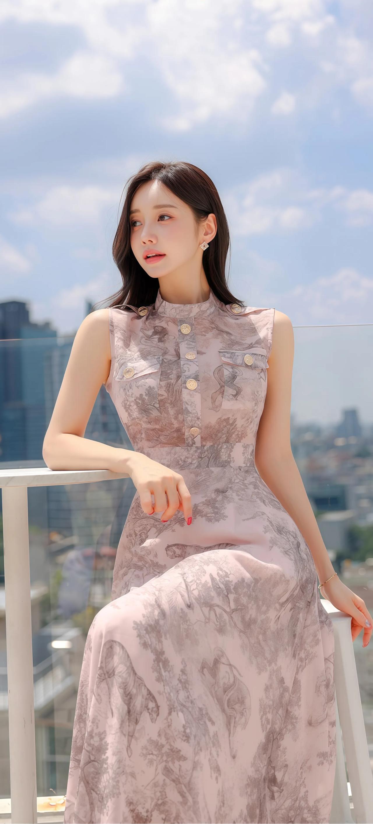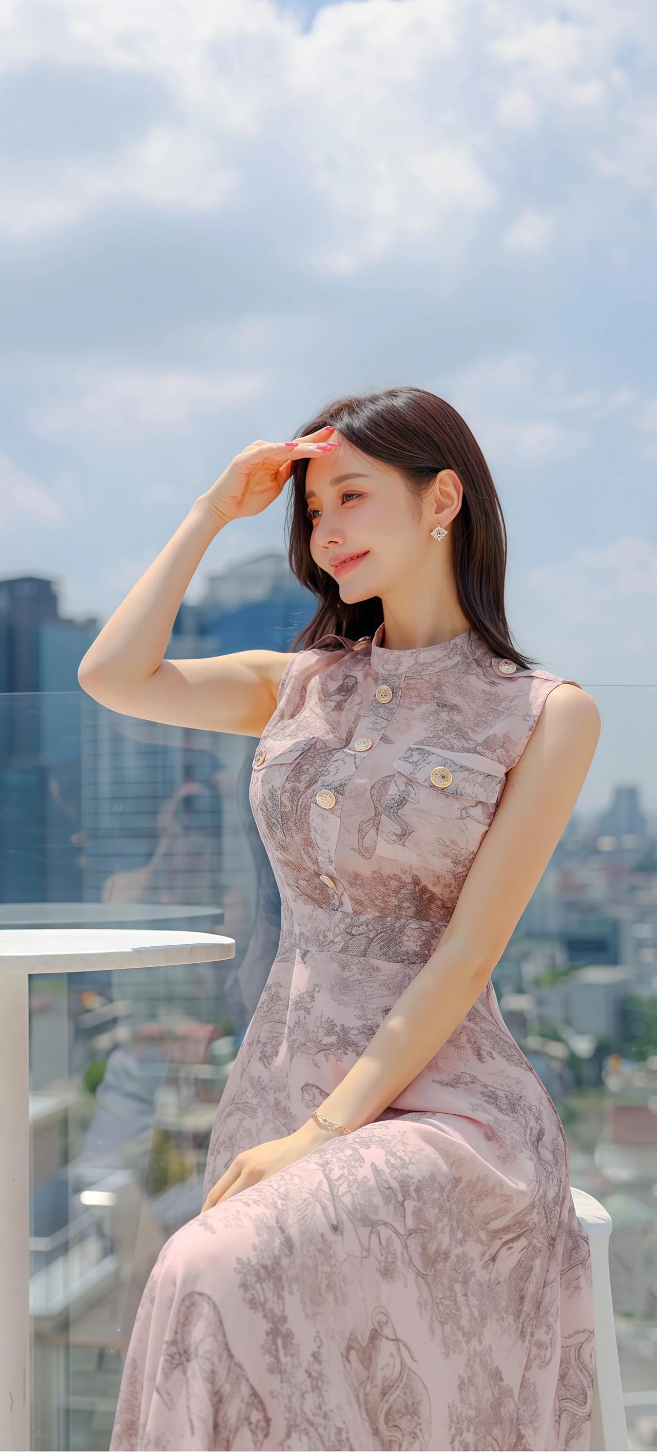 优雅气质,粉色印花长裙,都市天际线下的时尚穿搭