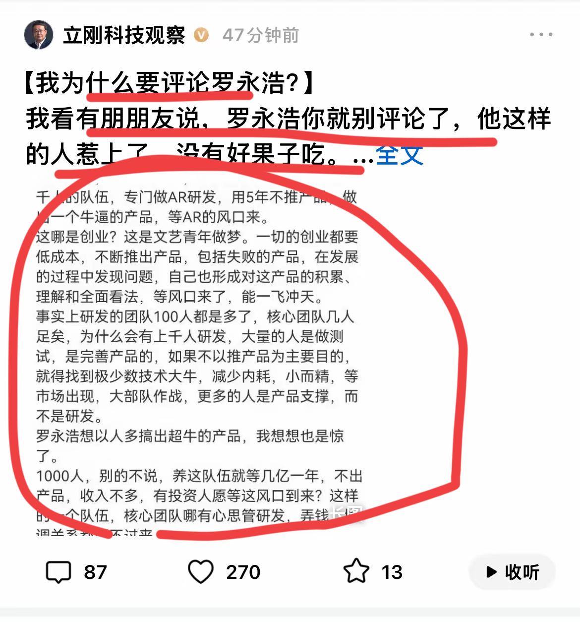罗永浩这回踢到铁板上了! 有网友说,老罗吵架从来不输任何人~ 唯一一次败给了星巴克的女咖啡师~ 这次,老罗算是遇到高手了~ 著名通信大师项总盯上老罗了, 两人你来我往,展开了交锋!! 项总火力全开,罗总并不打算认输~ 直接开骂项总这回很有礼貌,没有骂老罗是下等人,也没说他吃不起10元钱的早餐! 更没有爆粗口,直接问候家人朋友等! 难道项大师变得文明了,还是看人下菜碟呢? 到底鹿死谁手,我们拭目以待吧~