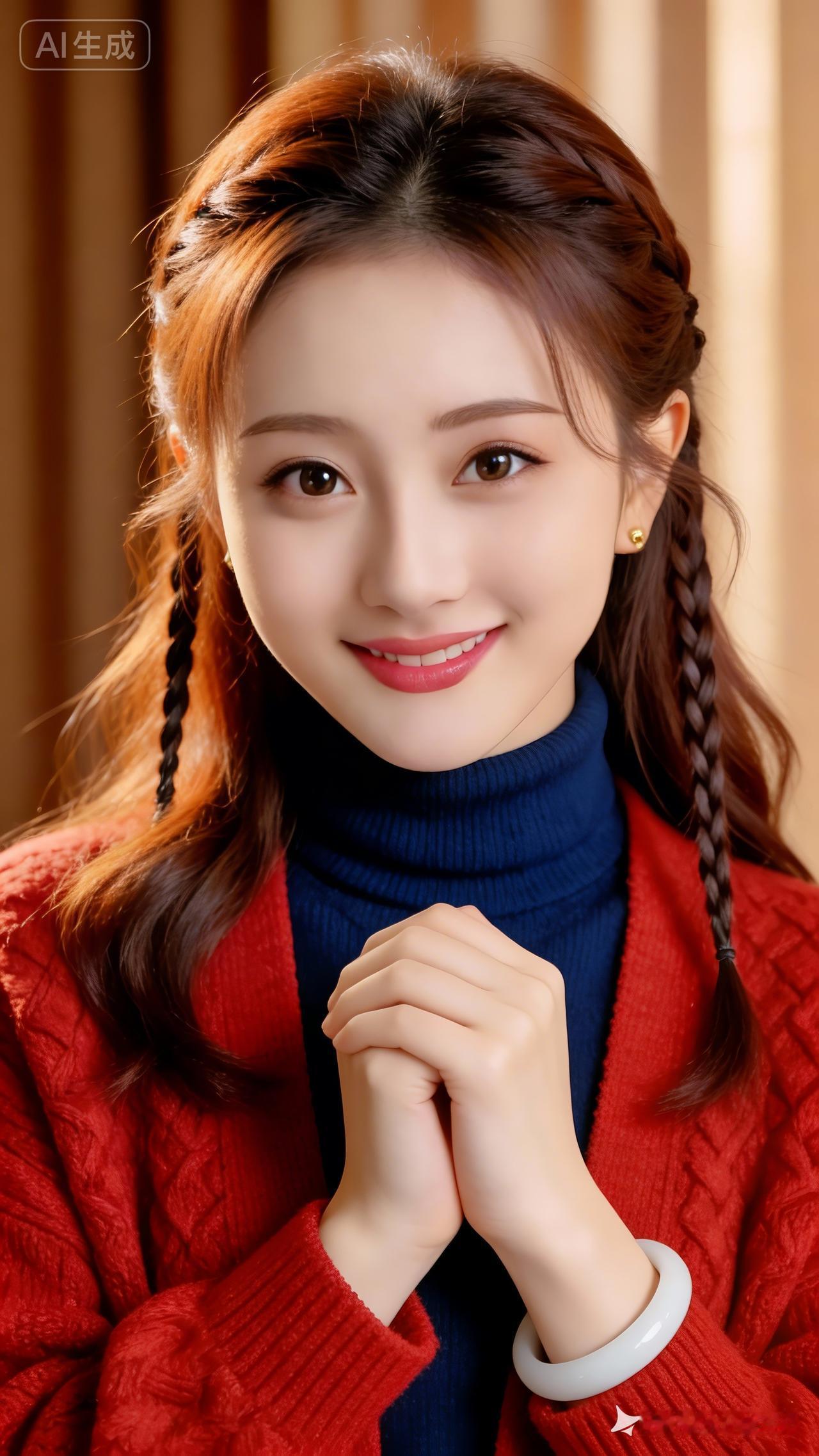 美女身着红色中式旗装,绣花精美,翡翠耳坠点缀,古建门窗背景朦胧,光影柔和,古典宁