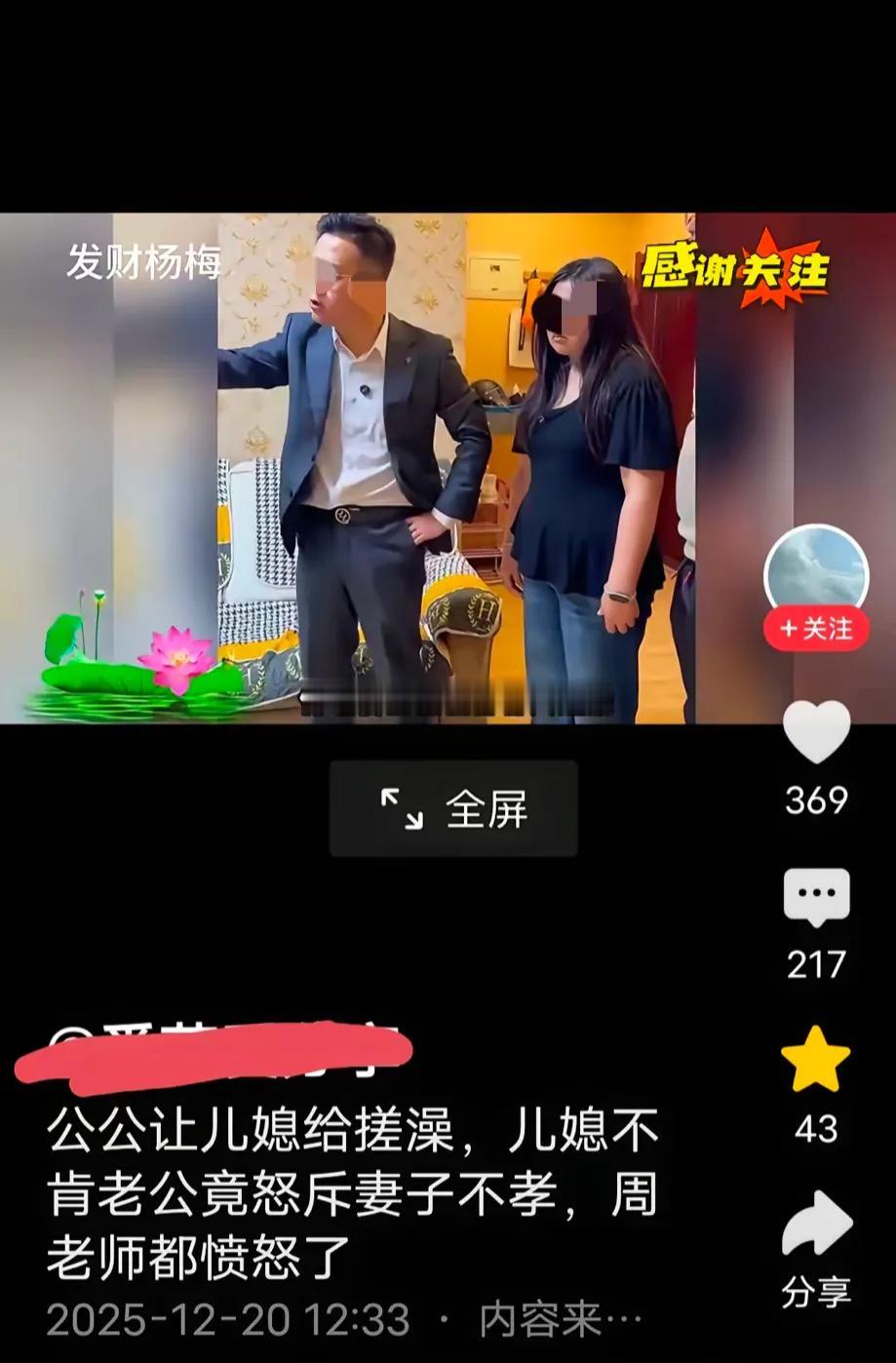 北京一60岁男子要儿媳妇给他搓澡,遭到拒绝,便骂儿媳不孝顺,儿媳妇向老公告状,没想到老公的话震碎她三观,网友:赶快离婚! 北京一60岁男子要儿媳妇给他搓澡,遭到拒绝,便骂儿媳不孝顺,儿媳妇向老公告状,没想到老公的话震碎她三观,网友:赶快离婚。 事情的细节比大家想象的更让人心寒。那天晚上老公提前跟儿媳妇说要加班到深夜,儿媳妇和公公在家,公公说自己洗澡时后背怎么都搓不到,让她进去帮忙擦一把。儿媳妇当时就愣住了,赶紧摆手拒绝,说男女有别实在不合适,要么等他儿子晚上回来再说。谁知道公公当场就翻了脸,嗓门一下子提了八度,说儿媳妇就是嫌弃他老了脏了,连这点孝心都不肯尽。 儿媳妇又委屈又生气,实在忍不住给加班的老公打了电话,想让他评评理。电话那头老公的声音带着不耐烦,听完事情经过后,居然直接说:“这不是你应该干的吗?孝敬父母本来就是天经地义的事,我爸都开口了,你推三阻四像什么样子。”这句话像一盆冷水,直接浇灭了儿媳妇心里最后一点希望,于是她提出离婚。 其实这事根本不是孝不孝顺的问题,而是尊不尊重的问题。公公明知道儿子加班不在家,还向儿媳提出这种越界的要求,本身就是没把儿媳的尊严当回事。而老公的态度更让人寒心,他不仅不保护自己的妻子,反而把“孝顺”当成枷锁,逼着妻子妥协。在很多家庭里,总有人拿“孝顺”当挡箭牌,突破人与人之间的边界,好像只要打着这个旗号,什么不合理的要求都该被满足。可真正的孝顺,是发自内心的关心和体谅,而不是逼着别人做违背底线的事。 女子说,她不怕吃苦也不怕付出,就怕自己的委屈不被看见。网友们知道这事之后,都纷纷劝她赶紧离婚,说这样的家庭根本不值得留恋。 我觉得网友的建议很实在,婚姻里最可怕的不是贫穷,而是伴侣的不理解和不支持。当你在家庭里受了委屈,他不仅不站在你这边,反而跟别人一起指责你,这样的婚姻还有什么意义呢? 各位读者你们怎么看?欢迎在评论区讨论。