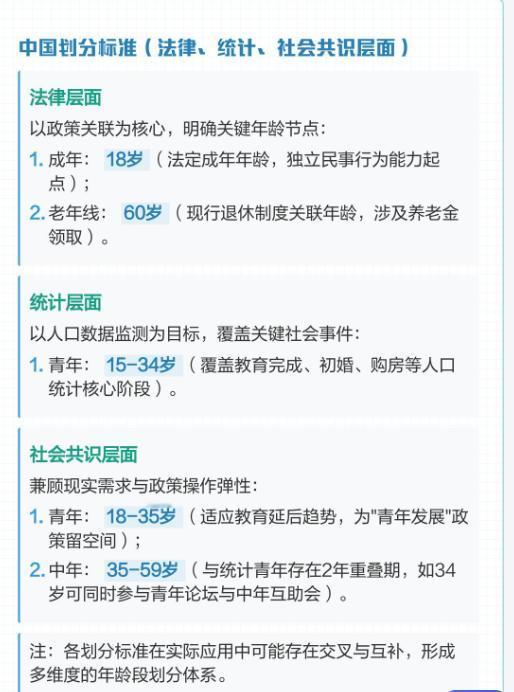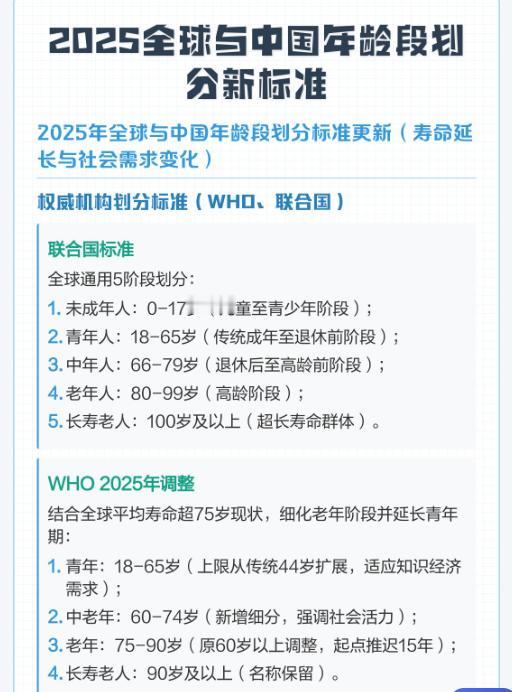 2025全球与中国年龄段划分新标准。联合国和WHO认定65岁还是青年人。在中国只有体制内,认定65岁还是青年人。其他的在34岁就该老了,准备退休的事情了。就是现在的人大学毕业,十年内要完成各种人生大事,结婚,买房,买车,生孩子,假如是读研的要5年内完成这些。 所以你说,现在的年轻人为什么都感觉到累。